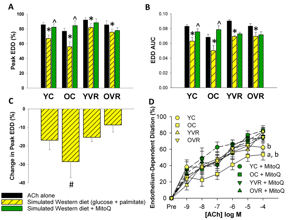 To determine the effects of acute exposure to a more physiologically relevant stressor, we exposed a sub-set of arteries (n = 7 (YC), 8 (OC), 4 (YVR), 8 (OVR)) to an ex-vivo, simulated Western diet via intraluminal infusion for 40 minutes prior to pre-constriction followed by assessment of EDD to ACh. This ex-vivo challenge comprised warmed physiological saline containing 8mM glucose (in addition to 5mM glucose already present in physiological saline, Sigma Aldrich Corp.) and 300 µM palmitate (Sigma Aldrich Corp.), two of the major metabolites present upon consumption of a Western-style diet high in saturated fat and sugar. These concentrations were selected to simulate those reported in the circulation of rodents following chronic consumption of Western-style diets [43,78–80]. The impairments in peak EDD and AUC induced by this ex-vivo simulated Western diet were determined as the relative reduction in peak EDD or AUC in the presence versus absence of ex-vivo simulated Western diet ([PeakEDDACh-PeakEDDWD/PeakEDDACh]x100; [AUCACh-AUCWD/AUCACh]x100).