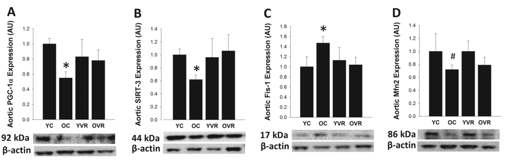 Because the carotid arteries, large elastic arteries, were used for ex-vivo measurement of endothelial function as described above, arterial protein expression was assessed using standard Western blotting procedures in homogenate from thoracic aorta, a representative large elastic artery, as performed previously [33,97]. To confirm that aortic expression of our proteins of interest was similar to that of the carotid arteries, we assessed expression of a subset of proteins in both carotid arteries and aorta from a separate group of young and old animals (n=6/group). Following homogenization in RIPA buffer, 15 µg of protein were loaded into 4-12% polyacrylamide gels for separation by electrophoresis (Criterion System, Bio-Rad Laboratories, Inc., Hercules, CA, USA). Proteins were transferred onto nitrocellulose membranes (Trans-Blot Turbo System, Bio-Rad Laboratories, Inc., Hercules, CA, USA) and incubated overnight with the following primary antibodies: peroxisome proliferator-activated receptor gamma co-activator 1-alpha (PGC-1α, 1:1000, Novus Biologicals, USA), NAD-dependent deacetylase sirtuin-3 (SIRT-3, 1:500, AbCam, Inc.), catalase (1:1000, AbCam, Inc.) heat shock protein 90 (Hsp90, 1:1000, Enzo Life Sciences, Inc.), Total OXPHOS Rodent Antibody Cocktail (containing antibodies against Complex I subunit NDUFB8, Complex II –30k, Complex III Core protein 2, Complex IV subunit I, and Complex V alpha subunit; 1:250, Novus Biologicals, USA), Fis1 (TTC11; 1:500, Novus Biologicals, USA), Mitofusin 2 (Mfn2; 1:500, AbCam, Inc.), and beta actin (normalizer, 1:2000, Cell Signaling Technology, Inc.).