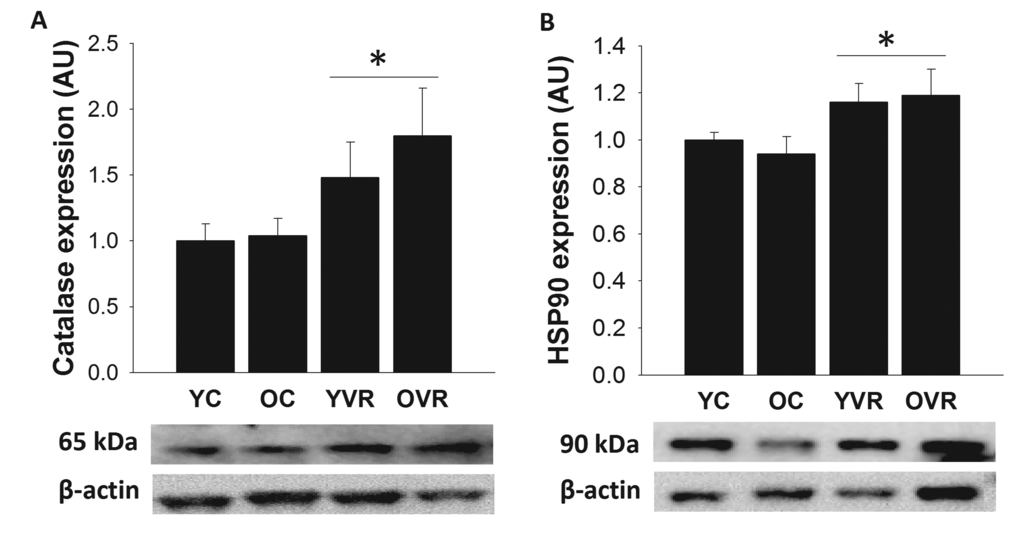 Aortic protein expression values of the antioxidant protein catalase and stress-response protein Hsp90 were not different in old versus young control mice (Figure 5). However, voluntary aerobic exercise significantly increased expression of catalase and Hsp90 in arteries from both young and old mice. These results indicate that voluntary aerobic exercise augments these key mediators of cellular antioxidant defense and stress response [24,47,48] in arteries, which may contribute to the improved resilience of arteries in exercising mice.