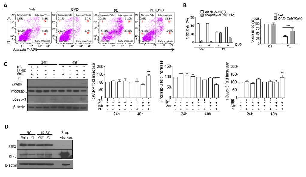 Next, we investigated the mechanism by which PL selectively kills SCs. Because PL induces apoptosis in cancer cells [31–41], we hypothesized that the same is true for SCs. We used Annexin V and propidium iodide staining and subsequent fluorescence-activated cell sorting to detect apoptosis, respectively, in senescent WI-38 cells. PL treatment increased the number of Annexin-V-positive cells in SCs by 5.5-fold when compared to the vehicle group (Fig. 2A). To further confirm that PL killed cells by apoptosis, we treated IR-induced WI-38 SCs with the pan-caspase inhibitor Q-VD-OPh (QVD) [42] to inhibit apoptosis. Ten µM QVD, in the presence of PL, significantly reduced apoptosis and partially rescued SCs from PL-induced death (Fig. 2A, B). In addition, western blot analysis showed elevated levels of activated caspase-3 and degradation of poly(ADP-ribose) polymerase (PARP) in PL-treated IR-SCs (Fig. 2C), confirming the apoptotic cell-death mechanism. Furthermore, PL had no effect on the levels of receptor-interacting protein kinase 1 and 3 (RIP1 and RIP3), indicating that PL did not induce necroptosis in IR-SCs (Fig. 2D) [43].