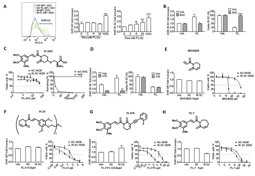 Structurally, PL contains two electrophiles, the C2-C3 and C7-C8 α,β-unsaturated imides, both of which are important for the toxicity of PL in cancer cells [30]. Thus, we investigated whether the integrity of the two-electrophile system was also important for the ability of PL to kill SCs. Consistent with the findings in cancer cells, 2,3-dihydro-PL and 7,8-dihydro-PL (Figure 1A), in which the C2-C3 olefin or the C7-C8 olefin was saturated, respectively, showed little or no senolytic activity toward IR-SCs (Fig. 1D).