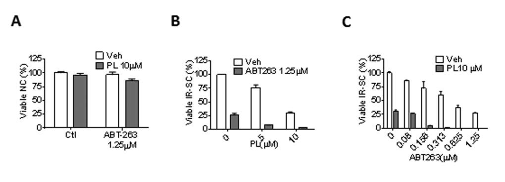 PL has been tested for its synergistic anti-tumor effect in combination with TNF-related apoptosis-inducing ligand [46], ataxia telangiectasia and Rad3-related protein inhibition [50], or a chemotherapeutic agent, such as cisplatin [33,34], paclitaxel [34], docetaxel [51], and gemcitabine [39]. Thus, we investigated the synergistic senolytic effect of PL and ABT-263 on IR-SCs. We tested 1.25 µM ABT-263 with 5 or 10 µM PL and 10 µM PL with 0.08-1.25 µM ABT-263; the ABT-263 concentrations were selected based on our recent studies [25]. The combination of 10 µM PL with 1.25 µM ABT-263 did not induce significant toxicity in non-senescent WI-38 cells (Fig. 4A). When the combinations were applied to IR-SCs, however, we observed significant synergistic effects (Fig. 4B-C). For example, treatment of SCs with 10 µM PL or 1.25 µM ABT-263 individually resulted in cell viability of 30.4% and 25.8%, respectively. However, the combined treatment with PL and ABT-263 killed almost all IR-SCs (Fig. 4C). The coefficient of drug interaction (CDI) method [52] was then used to evaluate the effects of PL and ABT-263; Table 3 gives the CDI values for these combinations. An additive effect for the combination of 10 µM PL and 0.08 µM ABT-263 (CDI = 0.99) was observed. The CDI values for the other combinations ranged from 0.02-0.41, indicating that PL and ABT-263 exerted a strong synergistic senolytic effect on IR-SCs. It is worth noting that, in our previous studies, increasing the concentration of ABT-263 from 1.25 µM to 5 µM did not increase cell killing in WI-38 SCs. PL appeared to eliminate the subpopulation of IR-SCs that was resistant to ABT-263.