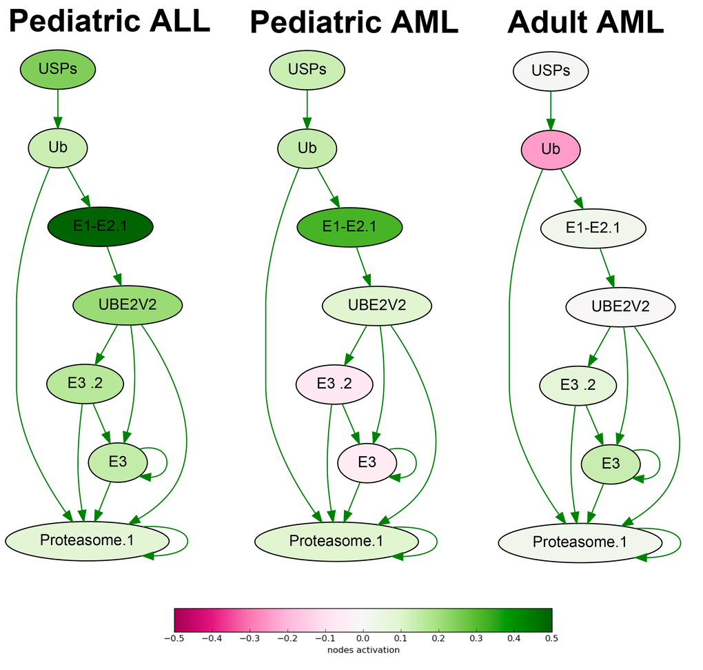 The functional role of a gene product in a pathway is reflected here by a discrete flag activator/repressor role (ARR), which equals 1 for an activator, –1 for a repressor, and shows intermediate values -0,5; 0,5 and 0 for the gene products having intermediate repressor, activator, or unknown roles, respectively. The CNRn value is the ratio of the expression level of a gene n in the sample under investigation to the average expression level in the control sampling. N is the number of individual gene products in the pathway p. The positive value of PAS indicates activation of a pathway, and the negative value - its repression in a biosample under investigation. The CNR and PAS values obtained for the normal and leukemia samples are shown on Supplementary dataset S2.