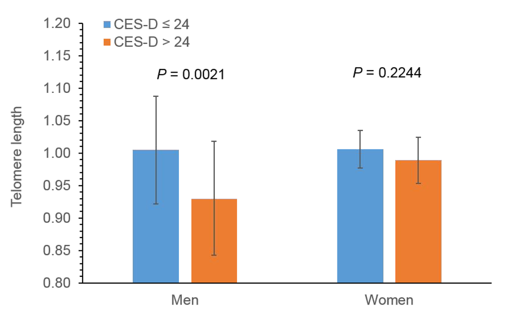 We identified a significant interactive effect between gender and severe depressive symptoms on LTL (Table 4). Even after adjusting for all covariates, men with severe depressive symptoms (CES-D > 24) had significant shorter LTL than those without (CES-D ≤ 24), whereas no significant association was found in women (Figure 1). In a fully adjusted model (Model 3), LTL were 1.0048 (95% CI: 0.9224, 1.0872) and 0.9301 (95% CI: 0.8425, 1.0178) for men with and without severe depressive symptoms, respectively (P = 0.0021). In women, LTL were 1.0059 (95% CI: 0.9224, 1.0872) and 0.9886 (95% CI: 0.9534, 1.0237) for individuals with and without severe depressive symptoms, respectively (P = 0.2244).
