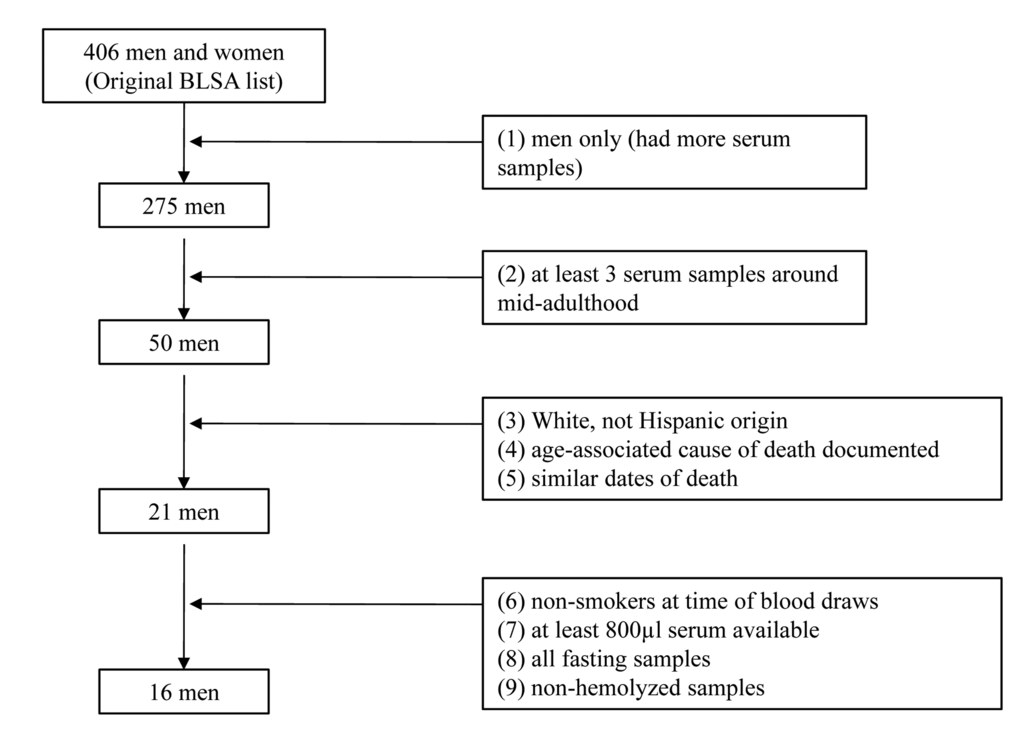 Longitudinal serum samples for this pilot study were obtained for 16 BLSA participants. The inclusion criteria were: male, availability of blood samples at around age 50 with at least three samples between ages 50 and 60, at least 800 µl of available serum, all fasting and non-hemolyzed samples (preventing introduction of miRNAs from red blood cells [39]), having a known cause of death, non-Hispanic White, and non-smoker (as miRNA dysregulation is linked to smoking-related diseases [40]) at the time of the blood draws. The assembly of participants for this study is provided in Figure 2. Eventually, we selected 16 participants (48 serum samples), all of whom had three blood samples taken within the range of ages 50, 55, and 60 (Figure S5). The sample was restricted to men because an inadequate number of women met the inclusion criteria.