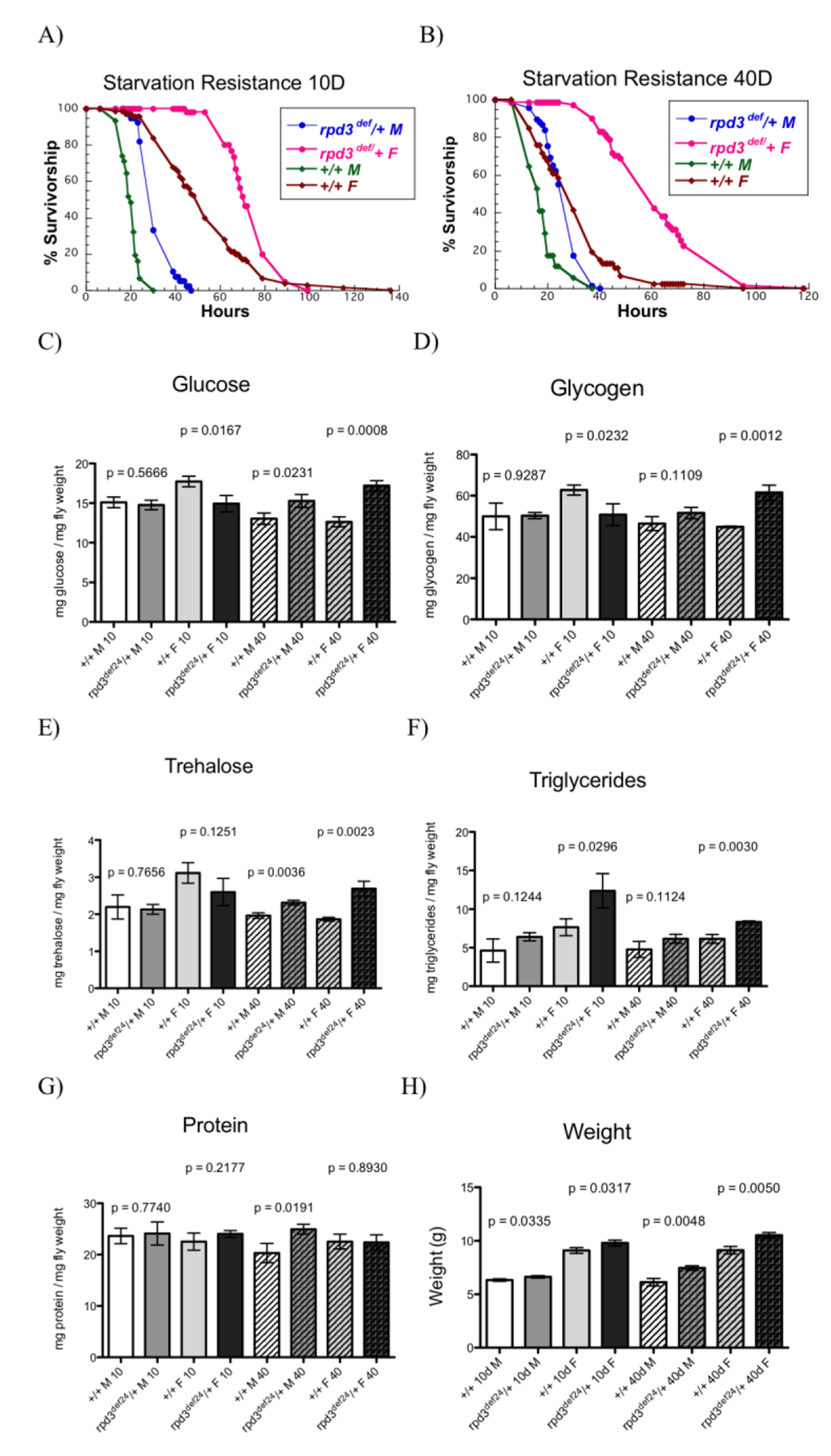 To examine the mechanism of the longevity extension observed in rpd3 mutant flies we examined how Rpd3 reduction affects fly physiology by examining resistance to starvation, oxidative stress, and fly metabolism. We used two different heterozygous rpd3 mutant alleles and their genetic controls, since homozygous rpd3 mutation is embryonic lethal [23]. We used rpd3 deficient (rpd3def/+) and their genetic controls, F1 progeny of rpd3def/+ littermates. We also used rpd3P-UTR/+ flies, an rpd3 hypomorph, and rpd3P-1.8/+, which are genetic controls for rpd3P-UTR/+ flies and have rpd3 reduction only in the eyes [24]. Here we show that rpd3def/+ mutant flies have higher starvation resistance at 10 and 40 days of age compared to control flies (Fig. 1 A,B; Supplemental Table 1A). Male rpd3def/+ flies are 38% and 44% more resistant to starvation at ages 10 and 40 days, respectively. Female rpd3def/+ flies are 28% and 108% more resistant at 10 and 40 days, respectively. To examine the potential mechanism of increased starvation resistance in rpd3 alleles we examined the effects of rpd3 reduction on fly metabolism. We quantified various forms of energy storage for the two rpd3 mutant alleles. At 10 days of age rpd3def/+ females have increased triglyceride levels, but reduced glucose and glycogen levels (Fig. 1C-G). At 40 days, rpd3def/+ female flies have increased levels of glucose, glycogen, trehalose, and triglycerides. rpd3def/+ males have increased levels of glucose and trehalose at 40 days, while no changes were observed at 10 days (Fig. 1C-F). Consistent with increased energy storage rpd3def/+ flies weighed more than control flies (Fig. 1H).