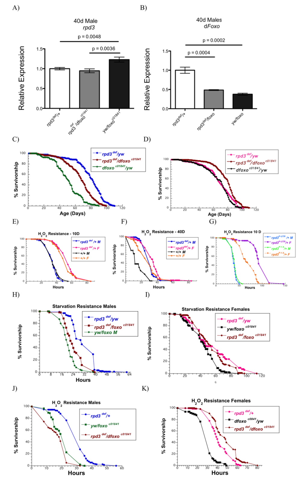 Reduced IIS is associated with increased resistance to oxidative stress. Since rpd3 reduction is associated with IIS reduction we examined if flies with reduced rpd3 levels are more resistant to hydrogen peroxide (H2O2). Male and female rpd3def/+ are more resistant to H2O2 compared to control flies at 40 days of age, while no difference was observed at age 10 days (Fig. 4E,F; Supplemental Table 3). Female rpd3P-UTR/+ flies are more resistant to H2O2 at both ages but no difference was observed in male rpd3P-UTR/+ flies (Fig 4G, Supplemental Table 3 and data not shown). To examine the role of dfoxo in increased stress resistance of rpd3 mutant flies, we determined starvation and H2O2 resistance of rpd3 mutant flies with or without dfoxo mutation. Similarly to longevity studies, rpd3def/+ male flies had the highest mean survival rate when exposed to starvation at 40d of age (Fig. 4H,I; SSupplemental Table 4). rpd3def/dfoxoc01841 double mutants had a lower mean survival, but they were more resistant to starvation than dfoxoc01841/yw flies (Fig. 4H,J). Similarly, male rpd3def/+ mutants are more resistant to H2O2 compared to rpd3def/dfoxoc01841 or dfoxoc01841/yw flies. These results suggest that dfoxo mediates some of the effects of rpd3 mutation on lifespan in Drosophila males and is required for full beneficial effects of rpd3 mutation on longevity and stress resistance. Female flies double mutant for rpd3def and dfoxoc01841 live longer and have similar starvation and H2O2 resistance compared to single rpd3def/+, but are more resistance compared to dfoxoc01841/yw mutant flies (Fig. 4D,I,K; Supplemental Table 5).