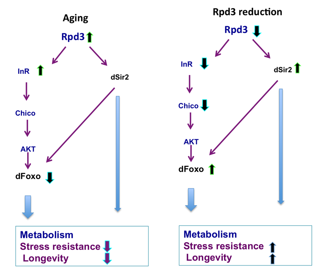 Histone deacetylase (HDAC) proteins are highly conserved enzymes whose major role is regulation of chromatin structure. Histone deacetylation increases chromatin compaction with subsequent inhibition of gene transcription. Class I HDACs are zinc-dependent histone deacetylases and include HDACs 1, 2, 3, and 8. HDAC1 affects a variety of processes such as proliferation, differentiation, and development [1,2]. Disruption of HDAC1 function has been associated with many disorders including cancer and neurodegenerative diseases including Alzheimer’s disease [3,4]. HDAC inhibitors are now used clinically for the treatment of several disorders including malignancies [5]. Rpd3, an orthologue of mammalian HDAC1, can also deacetylate lysine residues of various other proteins, such as P53, or bind to promoter region of other genes (p21 and p57) and affect their transcription [6]. Reduced expression of Rpd3 extends lifespan in yeast, worms and fruit flies [7–12]. Similar effects on Drosophila lifespan were achieved by feeding fruit flies 4-phenylbutyrate (PBA), a histone deacetylase inhibitor [3]. Despite all of these studies, the mechanism of the beneficial effects of decreased rpd3 on longevity remains poorly understood.