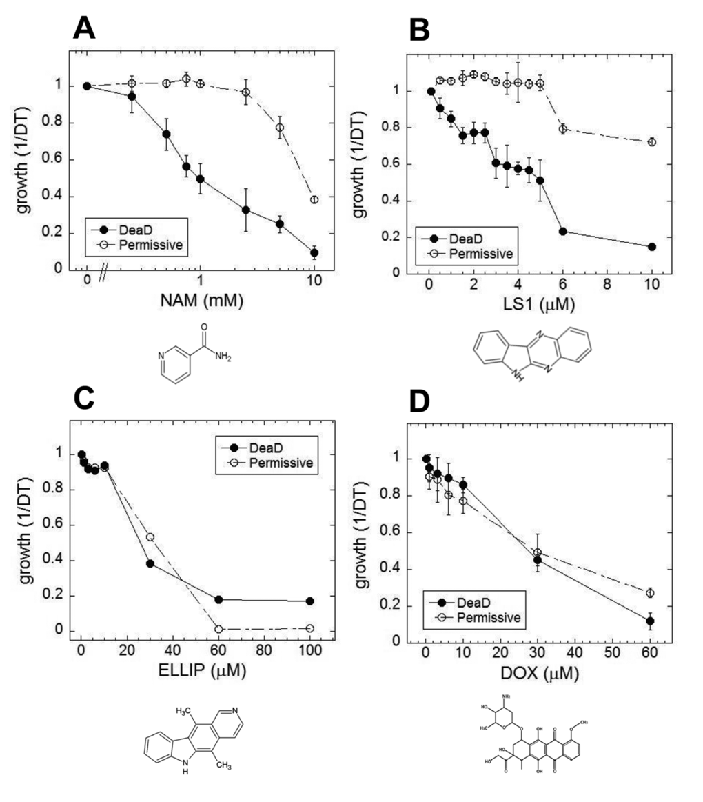 Small molecules that reduce DeaD cell growth under restrictive conditions, but minimally affect growth under permissive condition, are candidate probes that target longevity factors. An essential criterion for meaningful RLS shortening is a lack of toxicity at doses where statistically significant RLS shortening is observed. It is not interesting to shorten “apparent” RLS simply by making cells sick.