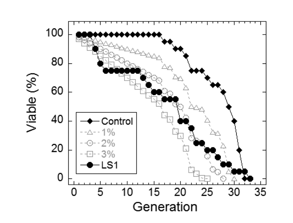 In yeast, nicotinamide (NAM) shortens RLS largely due to the compound’s activity as a feedback inhibitor of Sir2, though it inhibits other yeast sirtuins that affect lifespan and also prevents lifespan extension by caloric restriction by a sirtuin-independent mechanism [20–22]. As shown in Fig. 1A, NAM shortens DeaD lifespan at concentrations (IC50 = 1 mM) where it has no discernable effect on permissive growth. Similar to NAM, LS1 also exhibits dose-dependent DeaD lifespan shortening (DeaD IC50 = 5 μM) at concentrations where permissive growth is unaffected (Fig. 1B), though it is ~200-fold more potent than NAM. The DeaD assay RLS shortening activity of 1 μM LS1 was confirmed by standard microdissection assay (Fig. 2).