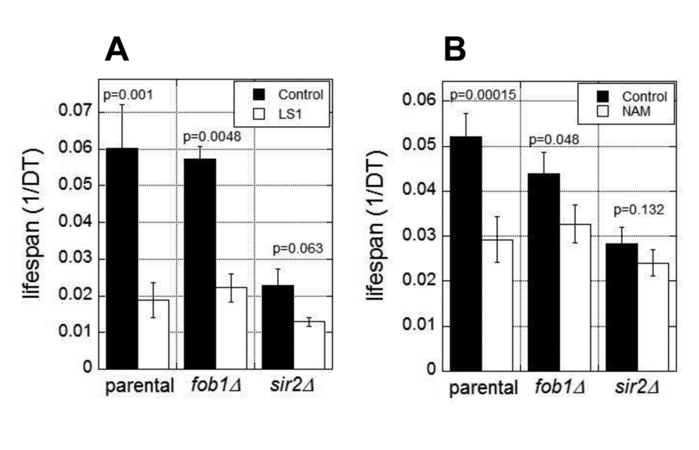 The RLS of yeast is normally limited by the age-dependent accumulation of extrachromosomal rDNA circles (ERCs) [23]. ERC formation requires Fob1 and is suppressed by Sir2 activity [24,25]. Thus fob1Δ cells are resistant to the lifespan shortening effects of SIR2 deletion and NAM [24]. To test whether LS1 acts in this pathway, for example, by directly or indirectly inhibiting Sir2, we assessed the effects of LS1 in fob1Δ and sir2Δ strains. As shown in Fig. 3A, LS1 effectively reduced DeaD lifespans in both fob1Δ and sir2Δ strains. In contrast, NAM, which acts predominately by inhibiting Sir2, shows significantly less DeaD lifespan shortening activity in fob1Δ and sir2Δ strains (Fig. 3B). The modest lifespan reduction by NAM in fob1Δ and sir2Δ strains may be due to its’ sirtuin-independent RLS-shortening activities [22]. We conclude that LS1 shortens RLS by an ERC- and Sir2-independent mechanism.