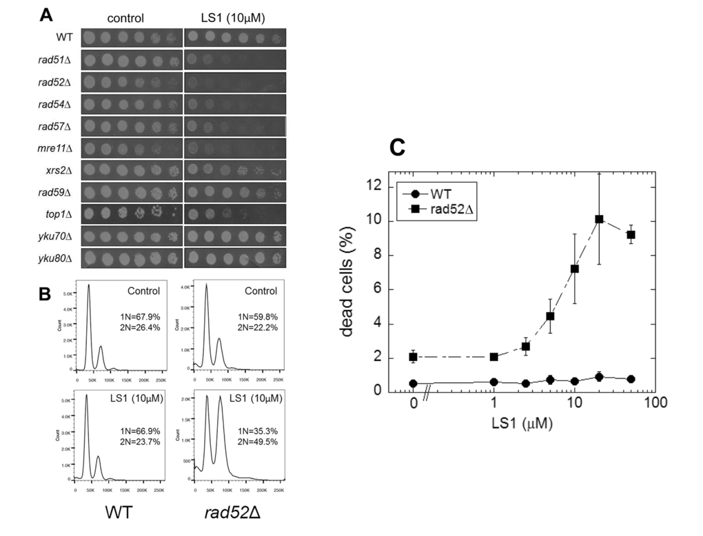 To gain insight into the mechanism of action of LS1 we performed a genome-wide chemical-genetic screen for deletions of nonessential genes that caused slow growth in the presence of LS1. This screen identified a set of genes belonging to the RAD52 epistasis group required for homologous recombination. Specifically, LS1 caused a slow growth phenotype in rad51Δ, rad52Δ, rad54Δ, rad57Δ, and mre11Δ cells. LS1 had no vegetative growth effect on yku70Δ or yku80Δ cells that are defective in DSB repair by nonhomologous end joining (NHEJ) (Fig 4A). Thus HR, but not NHEJ, is necessary for resistance to LS1. FACS analysis revealed that LS1-treated rad52Δ cells tended to arrest growth at G2/M (Fig. 4B). Parental cells treated with LS1 did not show a cell cycle phenotype. The growth defect of top1Δ cells in the presence of LS1 was of interest, since the only class of DNA damaging agents that have been reported to result in enhanced growth defects in top1Δ mutants are Top2 poisons [26]. top1Δ mutants are hypersensitive to Top2 poisons because these cells rely on Top2 for all topoisomerase functions that are normally shared by Top1 and Top2 [9,10,27]. Thus the sensitivity of top1Δ cells is fully consistent with LS1 being an yTop2 poison.