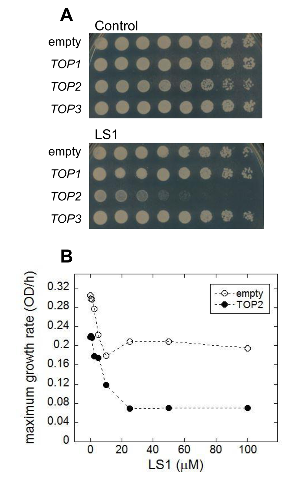 Negative chemical-genetic interactions with LS1 were initially determined by replica plating spots of similarly diluted mid-log cultures of the Yeast deletion collection library (GE Life Sciences [72,73];) on SCD and SCGal media lacking or containing 20µM LS1. Any patch showing less growth was confirmed more thoroughly by replica plating a series of spot dilutions of log-phase (OD600=1.0) cultures on media containing either DMSO (0.1%) in the absence or presence of various concentrations of LS1. To test if LS1 is a topoisomerase poison, high copy number plasmids from the Yeast Tiling Collection (Thermo Scientific) containing TOP1, TOP2, and TOP3 genes were isolated and transformed into the parental yeast strain BY4741 using Li-acetate/PEG with LEU2 as the selectable marker [74].