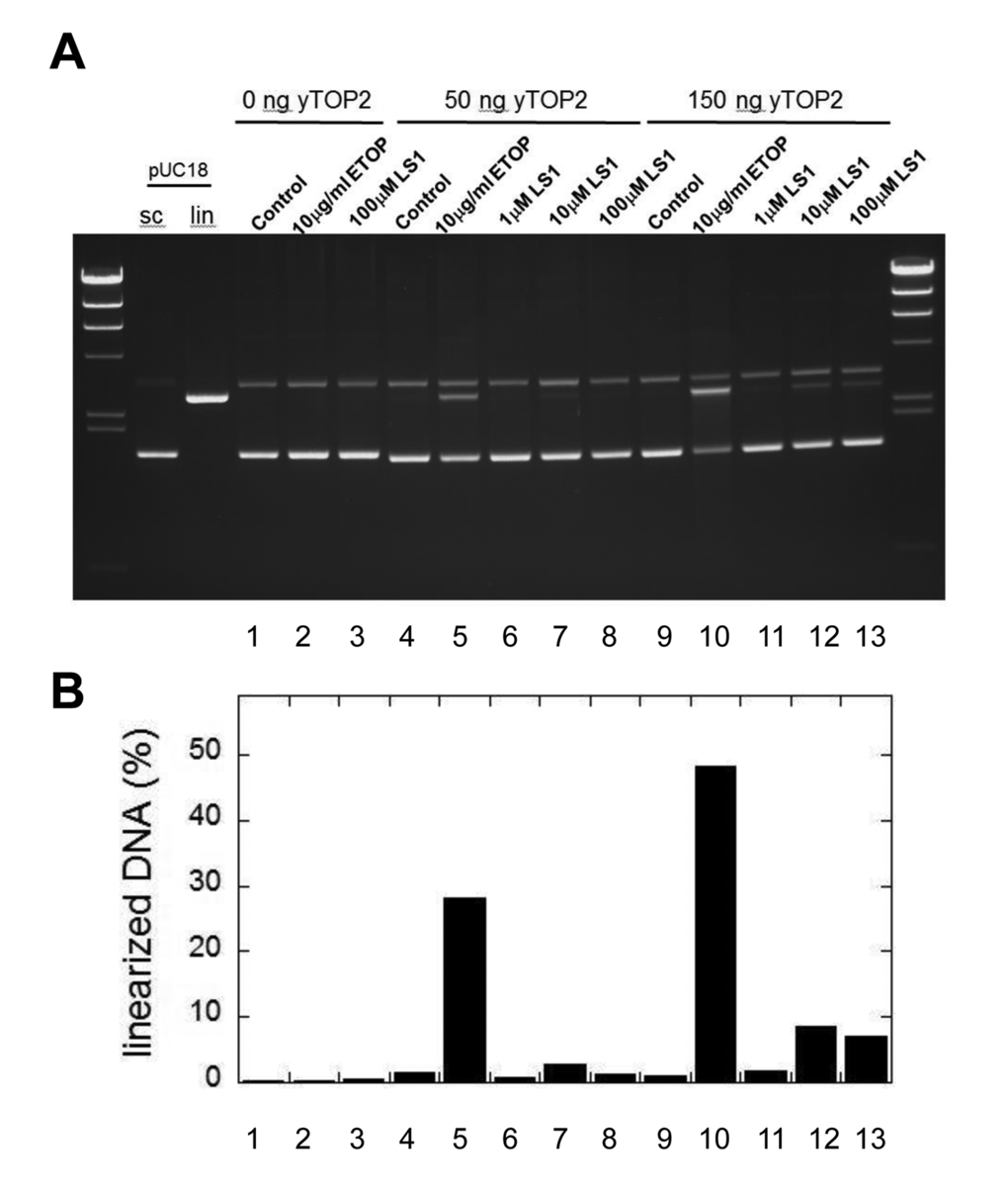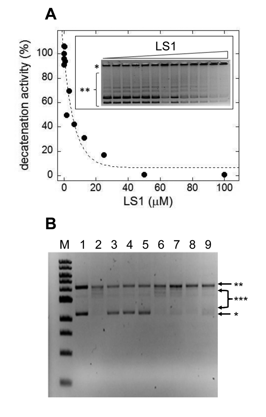 LS1 inhibition of hTop2-α was determined by measuring the effect of LS1 on the ability of hTop2-α to decatenate kinetoplastid DNA from Crithidia fasciculata. Human Top2-α was added to 0.2µg of kDNA (both were purchased from Topogen, Inc; Buena Vista, CO) in the presence of 1% DMSO (vehicle control) without or with increasing concentrations of LS1 as indicated. Samples were incubated at 37°C for 15min, and then reactions were terminated by the addition of an SDS buffer. Samples were resolved by 1% agarose 1xTAE gel and stained with ethidium bromide. Decatenated versus intact kDNA species were quantified by densitometry using GelQuant.NET1.8.2 software. Final % products were plotted using KaleidaGraph software.