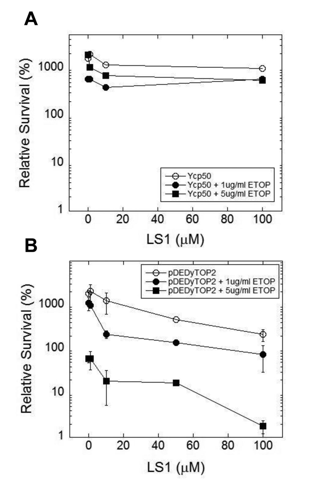 We hypothesized that LS1 induces the formation of Top2cc adducts that, in the absence of robust homologous recombination, cause cell death by the same mechanism—DNA damage—as classic Top2 poisons. However, unlike other Top2 poisons, LS1 is not toxic at concentrations where it has strong effects on RLS (Fig. 1B). We reasoned that LS1-Top2ccs might be more prone to lethal poisoning by a second more toxic poison. Thus LS1 could at least transiently target Top2 to DNA, effectively increasing the target population for attack by lethal Top2 poisons. As a test we quantified 0, 1 & 5 μM etoposide-induced cell death in the presence and absence of 0 -100 μM LS1 in yeast cells expressing native or overexpressed levels of TOP2. In cells expressing native levels of Top2, etoposide exhibited little toxicity with or without LS1 (Fig. 8A). As expected from a Top2 poison, etoposide exhibited a strong dose-dependent toxicity in cells overexpressing TOP2 (Fig. 8B). A physiologically relevant concentration of 10 μM LS1, which alone caused less than ~2-fold cell death in TOP2 overexpressing cells, enhanced 1 or 5 μg/ml etoposide toxicity by 10 and 8-fold, respectively. We hypothesize that LS1 enhances etoposide toxicity by transiently stabilizing Top2ccs that serve as good targets for etoposide poisoning.