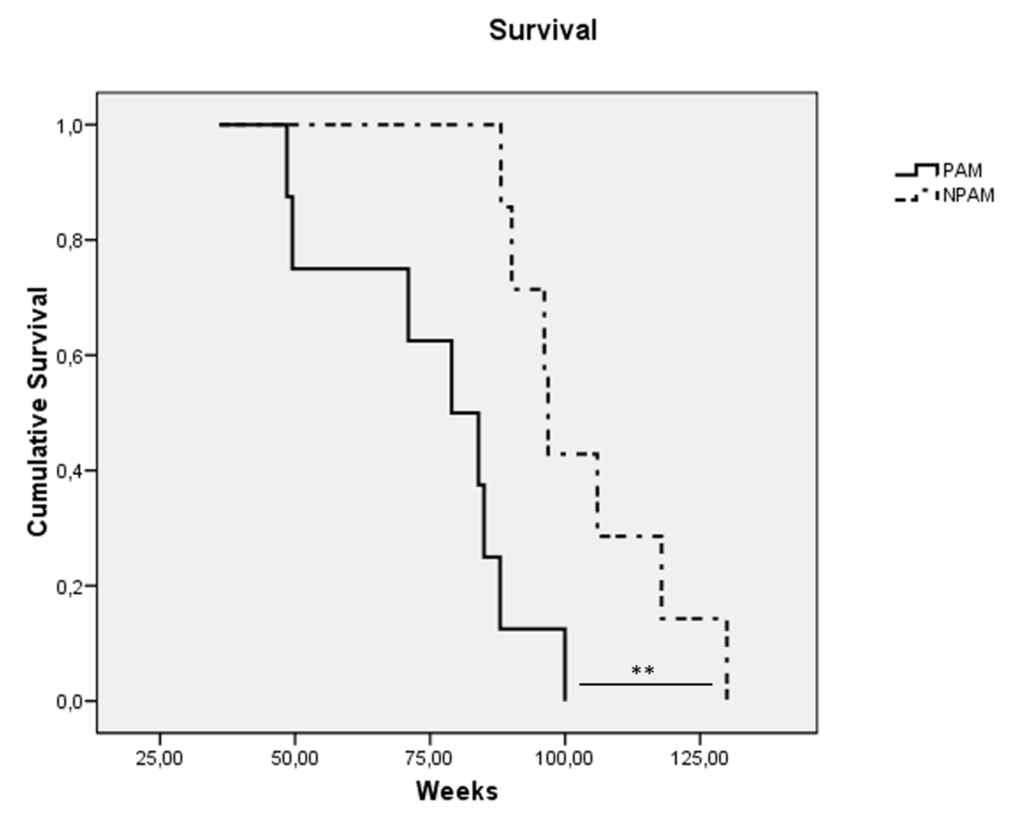 With regard to the study in the model of premature aging in mice, chronologically adult PAM showed lower values in all the immune functions analyzed (P<0.001) in relation to their adult NPAM counterparts (Fig. 1.A3 to Fig. 1.E3). Furthermore, in comparison to adult mice from the longitudinal study, PAM also showed significantly lower values (P<0.001) in chemotaxis of macrophages, NK activity and lymphoproliferation, as well as in phagocytosis (P<0.01). The values in PAM were similar to those observed in chronologically old mice. Moreover, PAM exhibited a shorter life span (P<0.01) than NPAM (Fig. 2).
