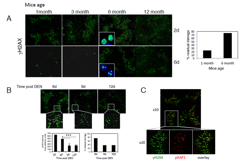 The heterochromatin protein KRAB-associated protein (KAP-1), a co-repressor of gene transcription, is phosphorylated by Ataxia telangiectasia mutated (ATM) at serine 824 in response to DNA damage. Phosphorylated KAP-1 (pKAP-1) forms foci overlapping with γH2AX at sites of DSBs [27,28] and was suggested to control DNA repair in heterochromatin [29,30]. We, therefore, performed immunofluorescence staining to detect pKAP-1 in liver tissue sections from various ages and at various time points following DEN injection. Like γH2AX, pKAP-1 foci were clearly evident after DEN injection, and were co-localized with relatively intense γH2AX-positive nuclei (Fig. 1C). The time-dependent appearance and recovery of pKAP-1 followed the same pattern and kinetics as γH2AX at all mouse ages (Supplementary Fig. S1B and not shown), thus confirming γH2AX results. However, pKAP-1 foci seemed to resolve better than γH2AX foci that are more persistent (Supplementary Fig. S1B).