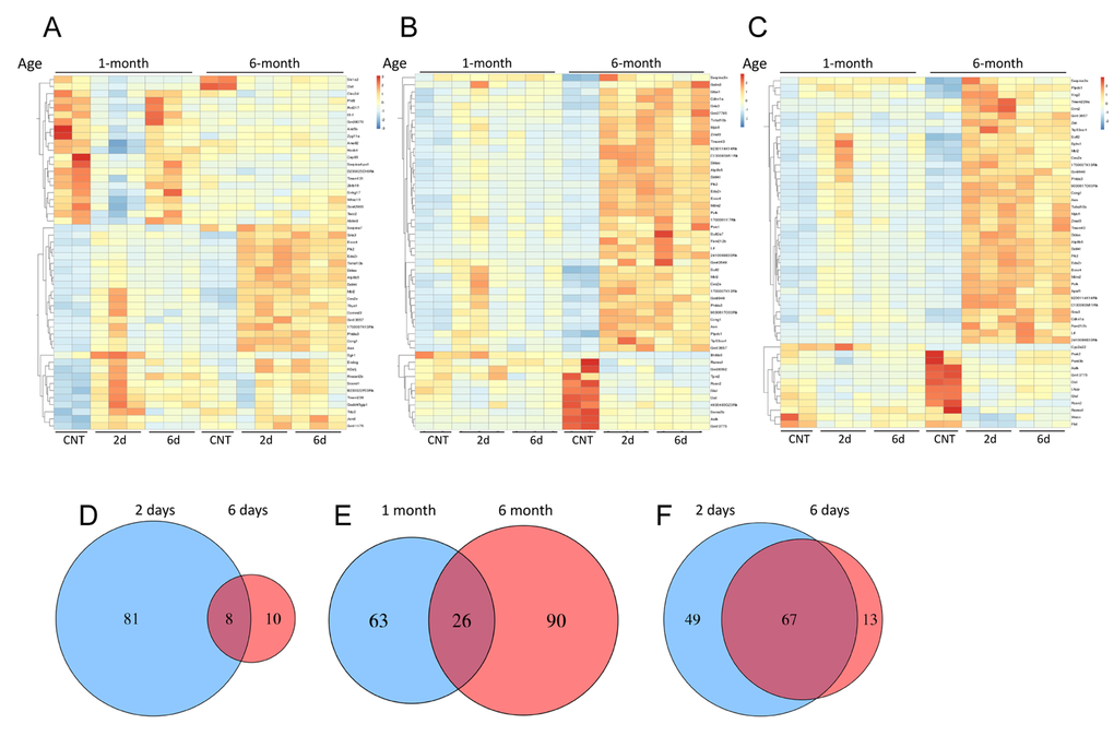 To more sensitively detect potential age-related changes in DEN-induced DNA damage response in the liver we used RNAseq analysis. We specifically looked for genes that are differentially expressed two and six days after DEN treatment in 1- and 6-month-old mice (the earliest age where DNA damage resolution decline was detected). Two days after DEN-treatment 89 differentially expressed genes were identified in livers of 1 month old mice that were classified into two clusters based on the expression profile using hierarchal clustering. One cluster contained 47 genes that were downregulated as compared to the control and the second cluster contained 42 upregulated genes (Fig. 2A). Overall, most differentially expressed genes (both up- and down-regulated) returned to baseline levels by day 6, thus demonstrating that the response to DEN was largely resolved at the transcriptome level. This hypothesis was reinforced by the finding that only eight of the 89 differentially expressed genes at day 2 were also differentially expressed at day 6, and all together only 18 genes were found to be differentially expressed in day 6 as compared to the control (Fig 2D). Remarkably, most downregulated genes in 1-month-old mice were not differentially expressed in 6-month old mice. In contrast, most upregulated genes in 1 month old mice were also upregulated in 6-month old mice, however they did not return to basal levels at day 6 (Fig. 2A).
