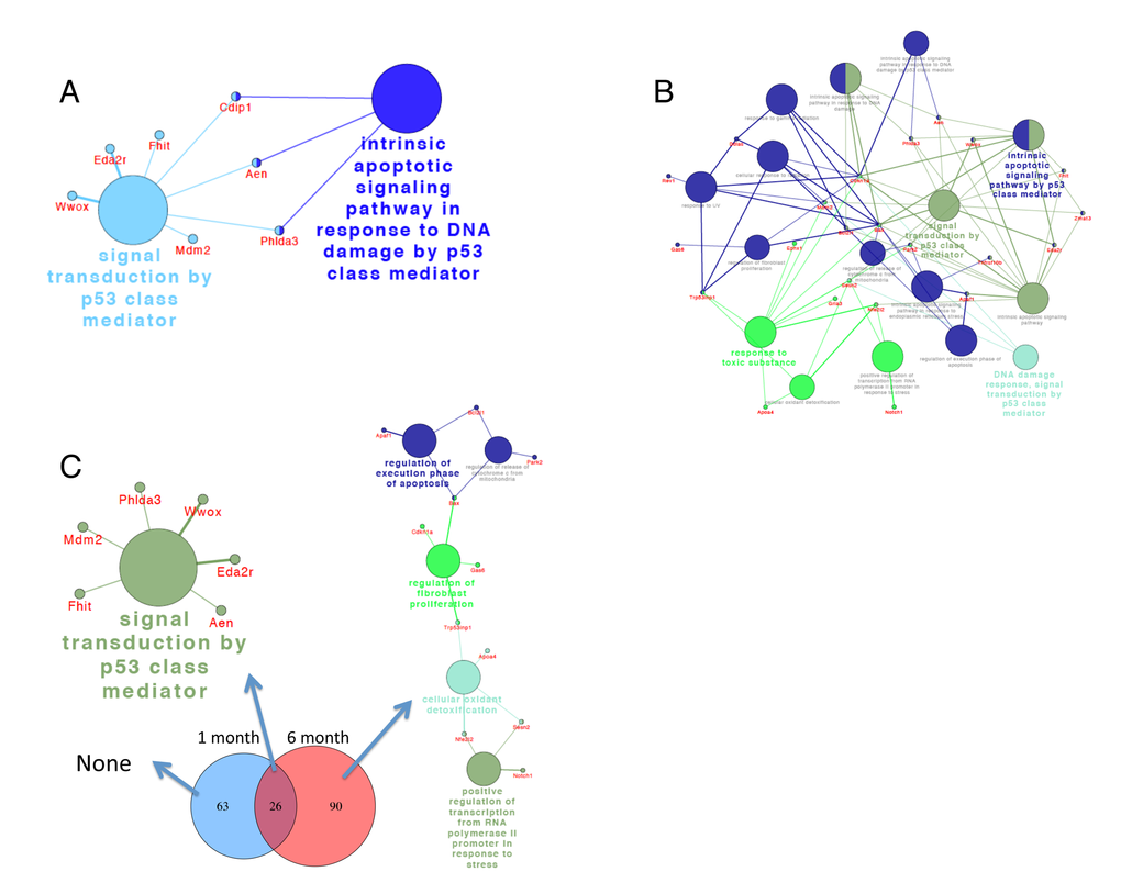 Genes associated with p53 signaling pathway and intrinsic apoptotic signaling pathway in response to DNA damage by p53 were significantly enriched 2 days after DEN injection in both 1-month and 6-month old mice (Fig. 3A-B). However, in 6-month old mice a more robust response was observed. In addition to these two pathways other related pathways and biological functions were also activated including the response to toxic substance, response to UV and gamma radiations and others (Fig. 3B). Consequently, the 26 common genes between the two groups were also associated with signal transduction by p53 (Fig. 3C). The fold change in expression of these shared genes was significantly higher in 6-month-old mice as compared to 1-month-old mice (Supplementary Fig. S3). No significant enriched signaling pathway or biological function was identified among genes that are unique to 1-month-old mice, whereas genes unique to 6-month old mice were enriched for regulation of execution of apoptosis, regulation of fibroblast proliferation, cellular oxidant detoxification, and positive regulation of transcription from polymerase II promoter in response to stress (Fig. 3C). Although the number of common genes between the two ages is surprisingly low, they share a similar functional response based on p53 module with an overall more robust response in 6-month old mice.