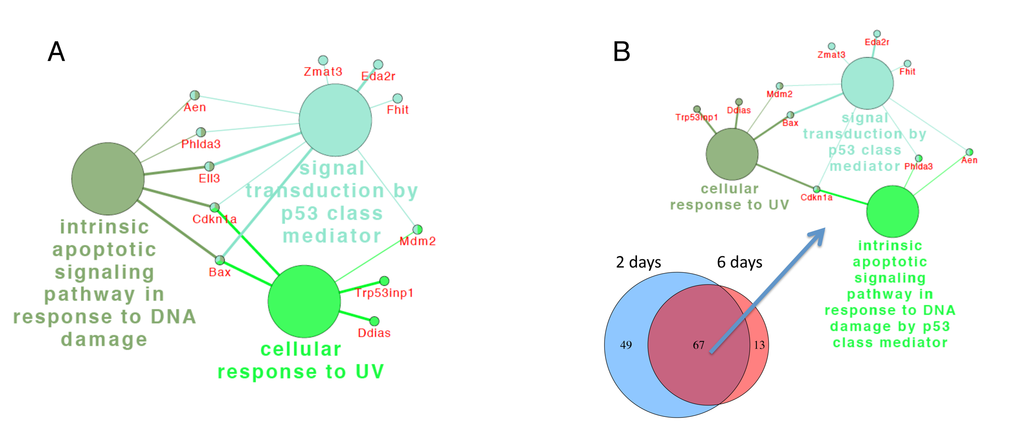 At day 6 after DEN treatment no significantly enriched pathway was detected in 1-month old mice. The most relevant biological processes found in genes differentially expressed in 6 month-old mice 6 days after DEN were p53-signaling pathway, intrinsic apoptotic signaling pathway in response to DNA damage by p53 and cellular response to UV (Fig. 4A). These pathways were shared between the two time points and were enriched in differentially expressed genes common to day 2 and 6 (Fig. 4B).