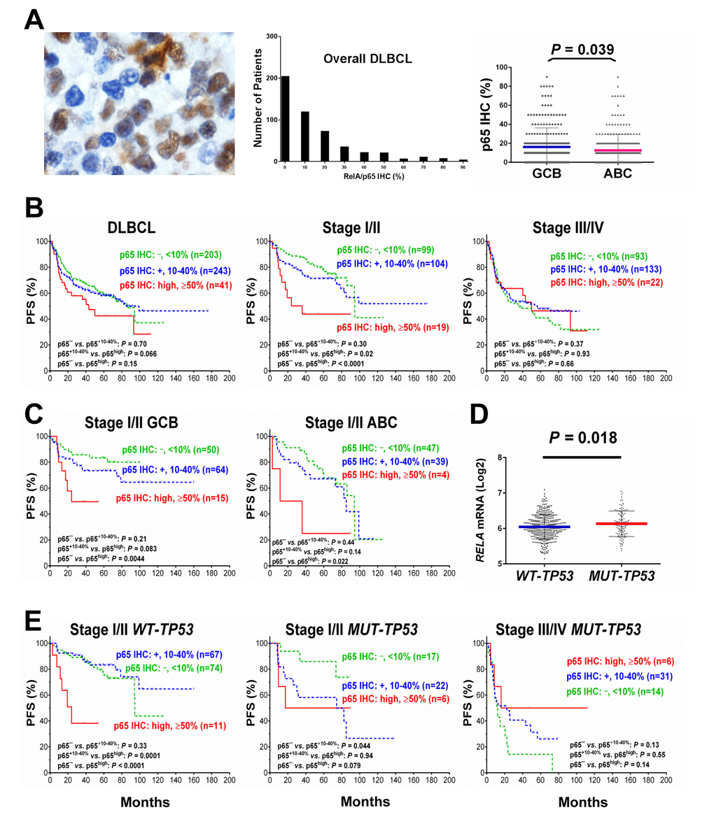In this study we studied the significance of RelA/p65 NF-κB in DLBCL by two ways. In the first part of this study, we evaluated the prognostic significance of RelA/p65 nuclear expression in a large cohort of de novo DLBCL treated with R-CHOP (n = 487). Although p65 nuclear expression may not be a strong prognostic marker in overall DLBCL, we found p65 hyperactivation (IHC ≥50%) had significant adverse impact on survival of patients with stage I/II DLBCL independent of cell-of-origin and TP53 mutation status, even though it was not associated with apparent genetic or phenotypic abnormalities, such as TP53 mutations, MYC/BCL2 translocation, and Myc/Bcl-2 overexpression.