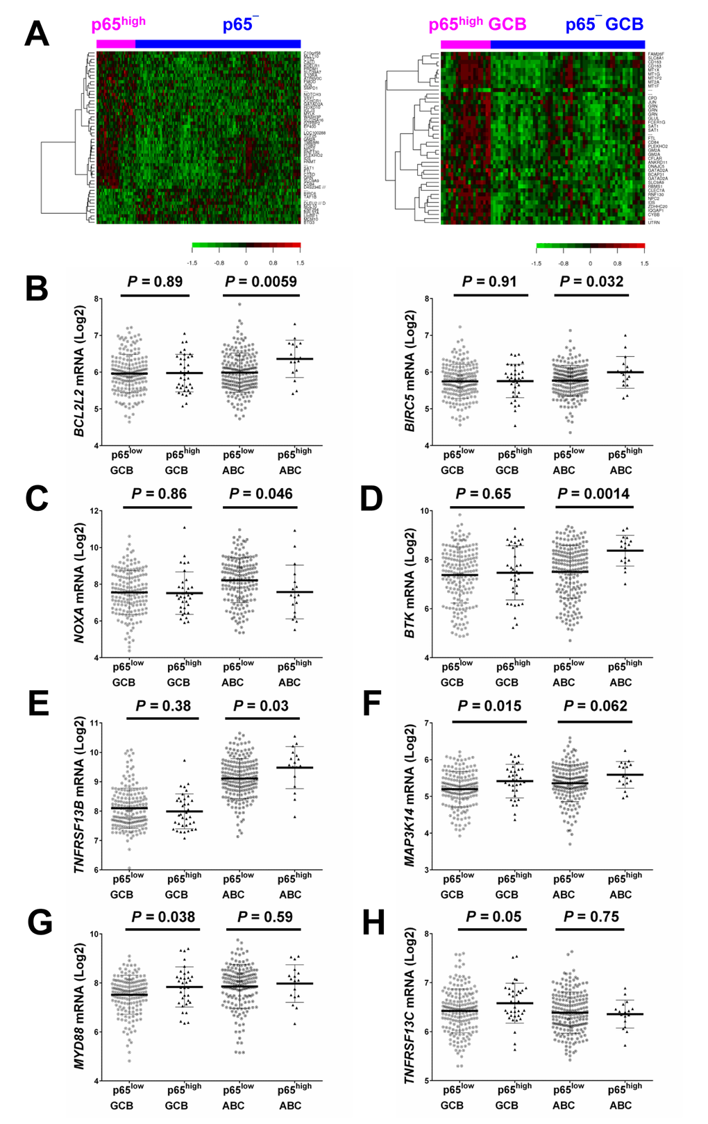 These data indicated that the antiapoptotic and pro-proliferation function of p65 was primarily activated in ABC-DLBCL, whereas immune dysregulation might be more relevant for the significantly adverse impact of p65 hyperactivation in GCB-DLBCL. We further analyzed the expression of p65-activating upstream signals in GCB- and ABC-DLBCL. TNFRSF1A encoding a TNF-α receptor which can activate NF-κB by degrading inhibitory IkBα (canonical activation), was upregulated in the overall p65high group than in the overall p65low group (P = 0.0001). LPAR3 which encodes a receptor for lysophosphatidic acid/LPA was downregulated in p65high DLBCL. In the ABC-DLBCL subset only, PSMB1, which encodes a 20S core beta subunit of the proteasome B-type family, was upregulated in p65high compared with p65low patients (suggesting canonical activation of NF-kB). Bruton tyrosine kinase gene BTK which plays an important role in BCR signaling activation (canonical activation), and TNFRSF13B which encodes the tumor necrosis factor receptor for APRIL and BAFF were significantly upregulated in p65high ABC-DLBCL but not in p65high GCB-DLBCL (Fig. 3D-E). In comparison, in GCB-DLBCL but not in ABC-DLBCL, TNFRSF13C which encodes the receptor specific for BAFF (non-canonical activation), MYD88 which encodes an adapter protein essential for the Toll-like receptor (TLR) and interleukin-1 receptor signaling pathways, and MAP3K14/NIK which is involved in non-canonical activation of NF-κB were significantly upregulated in the p65high compared with p65low group (Fig. 3F-H).