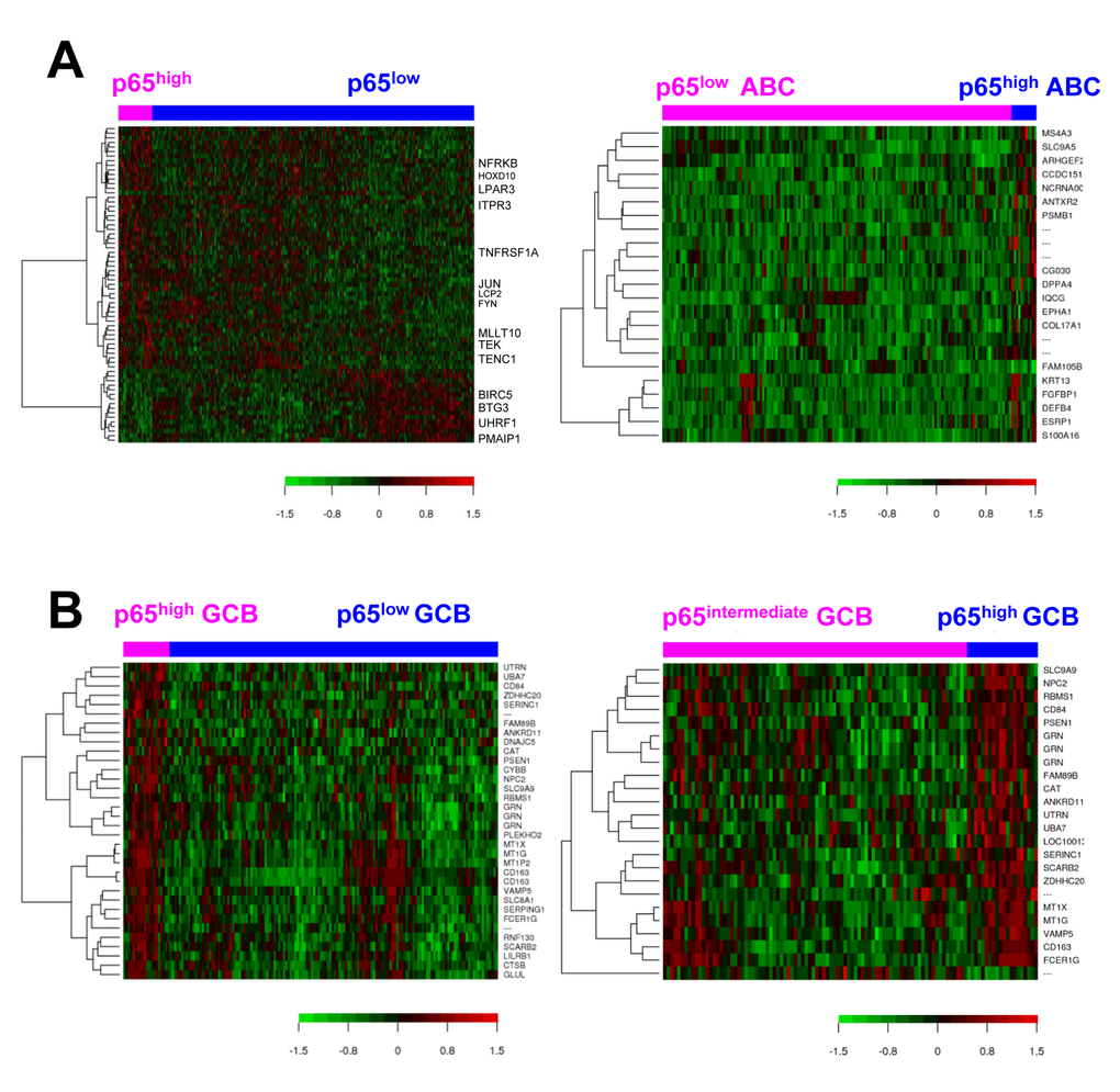To gain insight into the molecular mechanisms underlying the prognostic effects of p65 hyperactivation in DLBCL, we compared gene expression profiles of p65high and p65low tumors. p65high patients showed GEP signatures compared with other DLBCL including p65− DLBCL patients (IHC <10%), stronger in GCB-DLBCL than in ABC-DLBCL subset (Fig. 3A, Fig. 4, Tables 3-4).