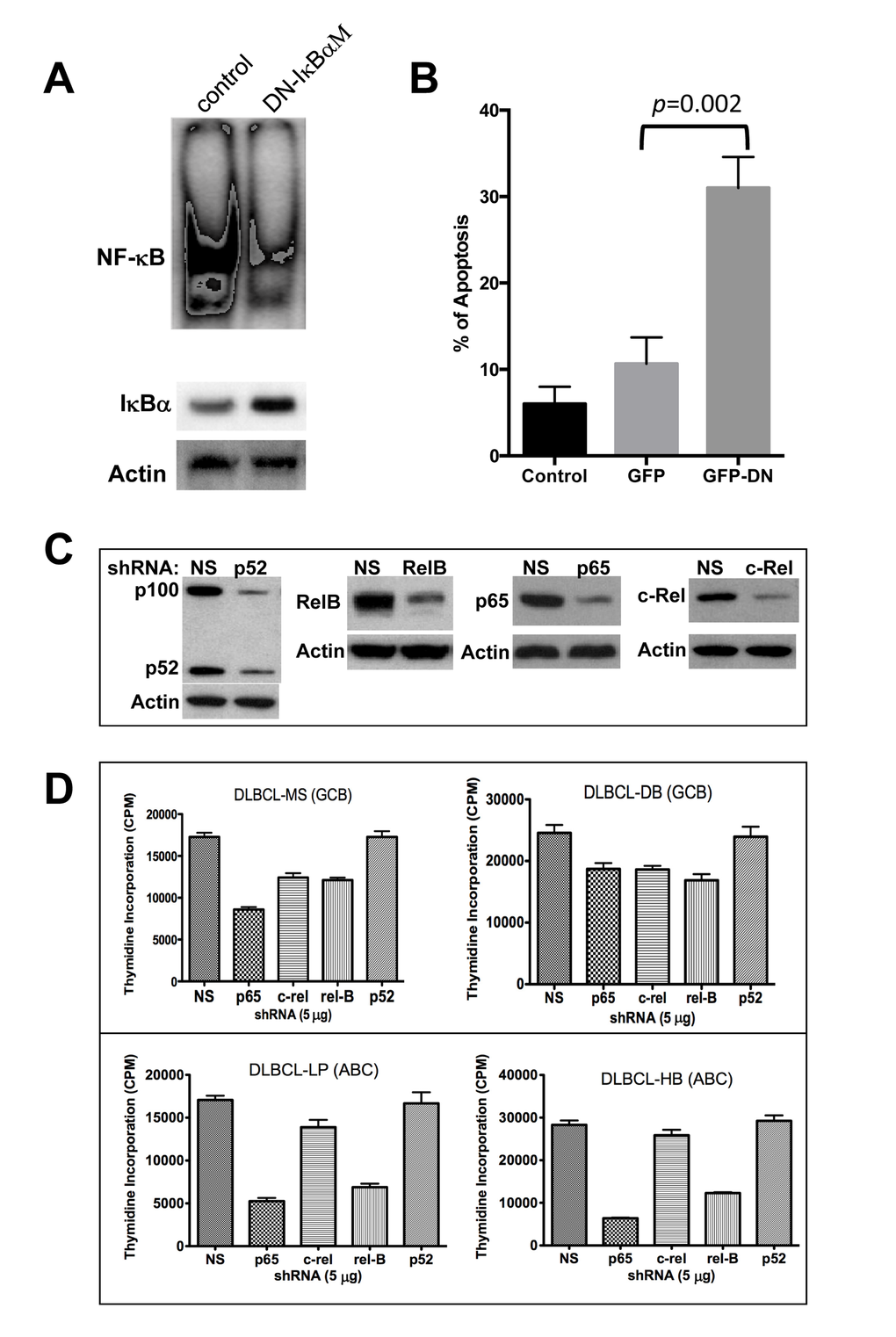 To determine the functional significance of each NF-κB subunit on growth and survival regulation in DLBCL, we used specific validated shRNAs to selectively silence each NF-κB component individually in four representative DLBCL cell lines (two GCB-DLBCLs, two ABC-DLBCLs). These validated shRNAs inhibited endogenous NF-κB by more than 70% (Fig. 5C). Except for p52, downregulation of p65, c-Rel, and RelB protein expression with individual shRNAs inhibited DLBCL cell growth (thymidine incorporation assay), and inhibition of p65 was most effective (Fig. 5D), particularly in cell lines with mutated p53 (MS, LP and HB).