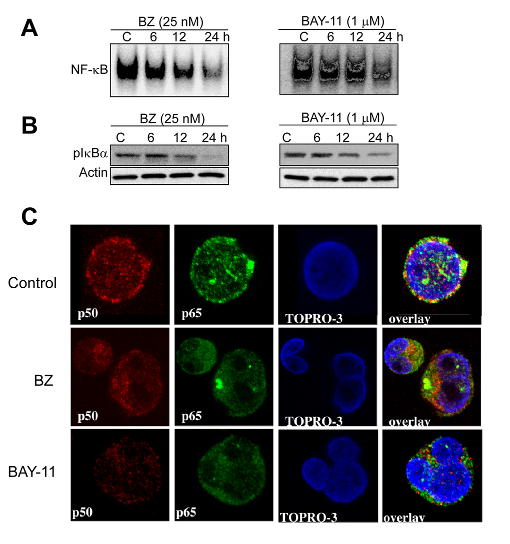 DLBCL cells were treated with increasing doses of bortezomib (0–50 nM), or organic compounds BAY 11-7082/BAY-11 (1µM) for 6-48 hours and subjected to cell proliferation assays, electromobility gel shift assay (EMSA), immunofluorescence, apoptosis detection assay, and cell cycle analysis according to the manufacturer's instructions or procedures as previously described [51]. Data are representative of three independent experiments.