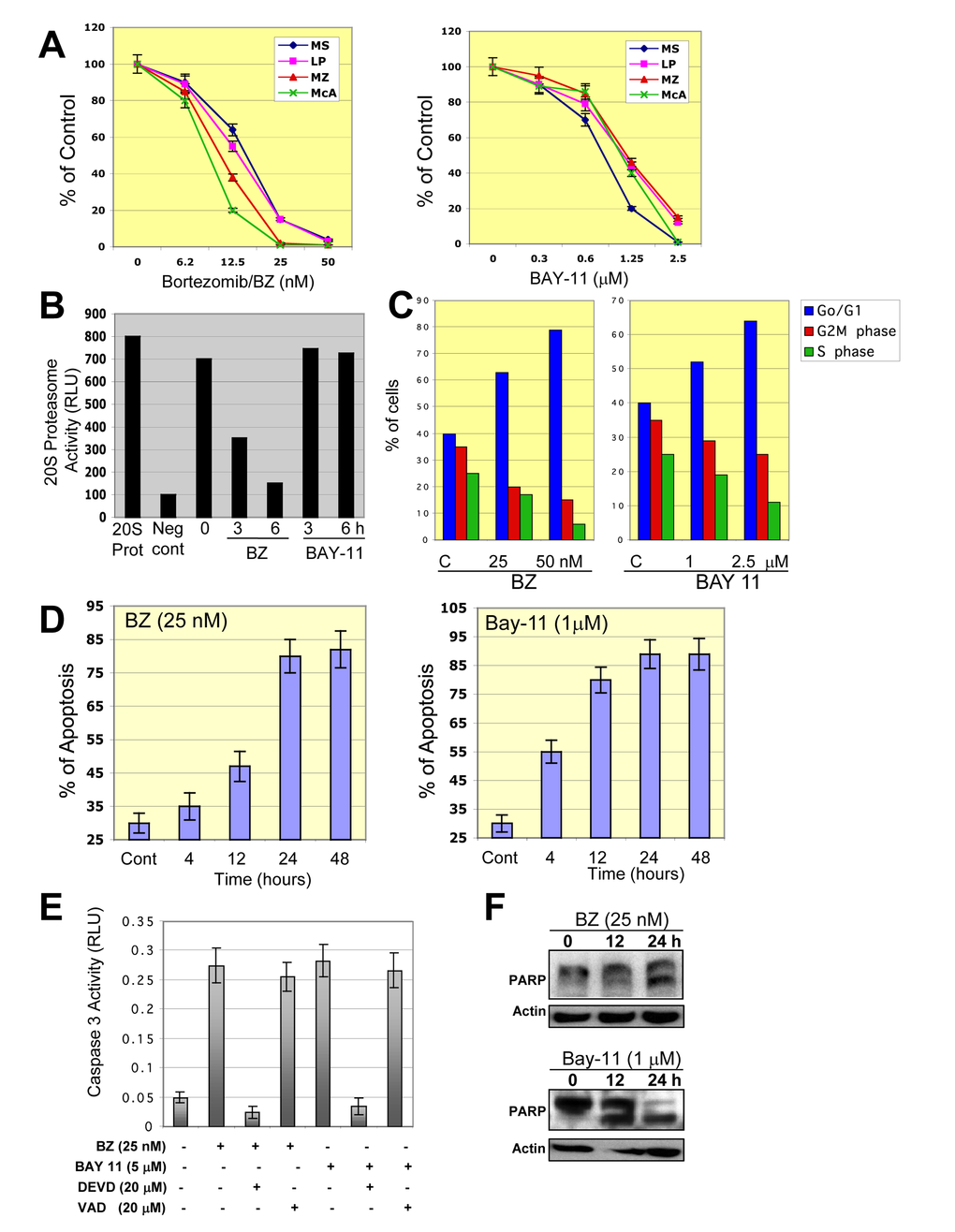 To ascertain whether BZ or BAY-11 has an effect on constitutive NF-κB activation in DLBCL cells, we performed EMSA with nuclear extracts purified from BZ- or BAY-11-treated GCB-DLBCL cell line (MS). After BZ or BAY-11 treatment, NF-κB DNA-binding activity (Fig. 6A) and the level of phosphorylated-IκBα (Fig. 6B) gradually declined in a dose-dependent manner in the MS DLBCL cell line. Confocal microscopy analysis also demonstrated that BZ or BAY-11 treatment inhibits the nuclear accumulation of p50 and p65 NF-κB subunits, leading to DNA fragmentation, indicative of cells undergoing apoptosis (Fig. 6C). Next, we evaluated the effects of BZ or BAY-11 on DLBCL cell viability using in vitro proliferation assays in four representative DLBCL cell lines (two ABC, two GCB). Both BZ and BAY-11 inhibited cell proliferation in the representative DLBC cell lines in a dose-dependent manner (Fig. 7A). BZ and BAY-11 inhibit NF-κB by different mechanisms, as we analyzed the cell lysates from BZ-treated and BAY-11-treated DLBCL-MS cells to a 20S proteasome proteolysis assay, and found proteasome activity was substantially inhibited (>50%) after 3 hours of BZ treatment, whereas BAY-11 treatment did not affect proteasome activity in a similar time points (Fig. 7B). To determine whether the cell growth inhibition effects of BZ and BAY-11 involve their activity in the cell cycle regulation, we analyzed the cell cycle profile. As shown in Fig. 7C, in a representative DLBCL cell line (MS), both BZ-and BAY-11-treated DLBCL cells accumulated in the G0/G1 phase of the cell cycle, while cells in G2M and S phases were decreased. In addition, BZ or BAY-11 treatments in MS DLBCL cell line resulting in cells undergoing apoptosis in a time-dependent manner (Fig. 7D). To verify that these cells had actually undergone apoptosis, we measured the generation of caspase 3 activities. DLBCL cells treated with BZ or BAY-11 activated caspase 3 activity after 12 hours of treatment, which can be block with a caspase 3 inhibitor (DVED) but not with a caspase 1 inhibitor (VAD) (Fig. 7E). In addition, a known caspase substrate, poly-(ADP-ribose) polymerase (PARP), was cleaved after BZ or BAY-11 treatment (Fig. 7F). These experiments provide additional and interesting insights into the putative role of NF-κB in DLBCL cell proliferation and viability maintenance.
