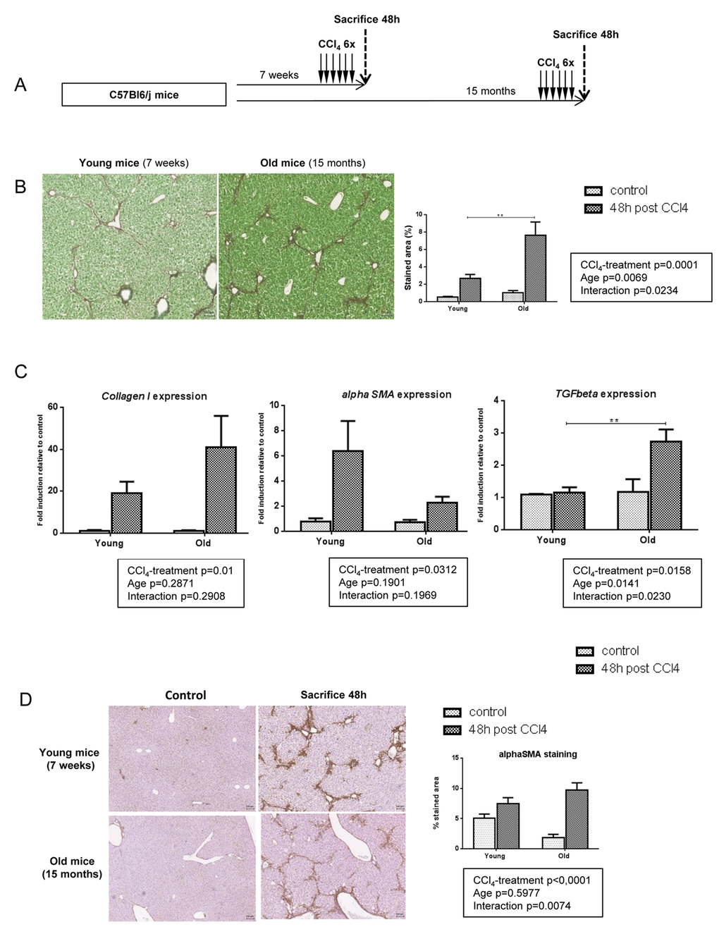 No difference was observed in terms of body weight, liver to body weight ratio and hepatic macroscopic and microscopic aspect between young (aged 7 weeks) and old (aged 15 months) mice (data not shown). Fibrosis was induced by CCl4 injections (3x/week for 2 weeks) in young and old mice (Figure 1A). Liver damages were evaluated two days after the last CCl4 injection, a time point known to correspond to the peak of fibrosis [21].