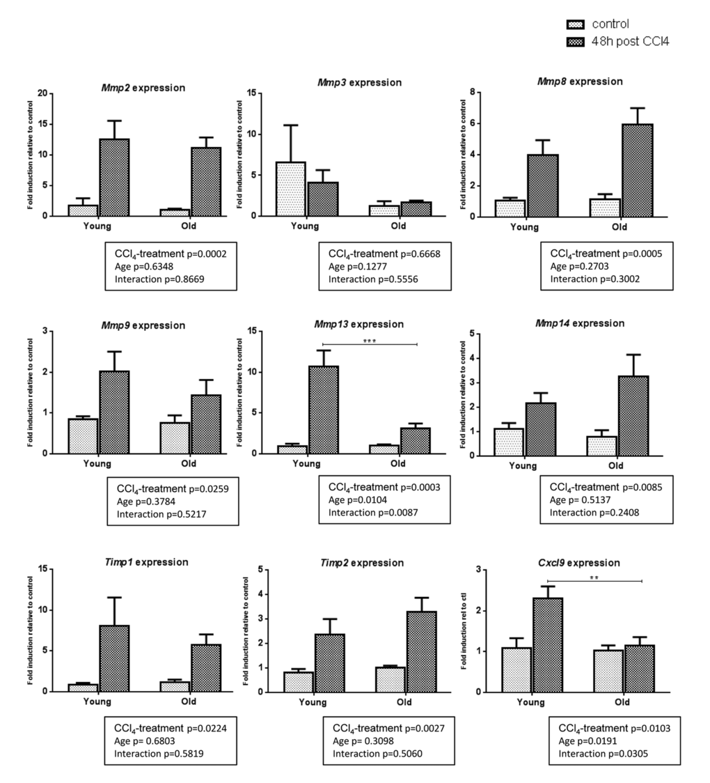 Liver fibrosis is a dynamic process resulting from an imbalance between ECM production (fibrogenesis) and degradation (fibrolysis). As we showed that fibrogenic processes were unlikely to account for the difference in intensity of fibrosis observed between groups, we studied the gene expression of matrix remodeling enzymes. CCl4 induced similarly Mmp2, Mmp3, Mmp8, Mmp9, Mmp14 and MMP inhibitors Tissue inhibitor metalloproteinase 1 (Timp1) and Timp2 in the two age-groups but we observed a significantly higher induction of Mmp13 in young mice than in old ones. In addition, Chemokine (C-X-C motif) ligand 9 (Cxcl9), a potent MMP-13 inducer, is upregulated in young fibrotic livers but not in old ones (Figure 2).