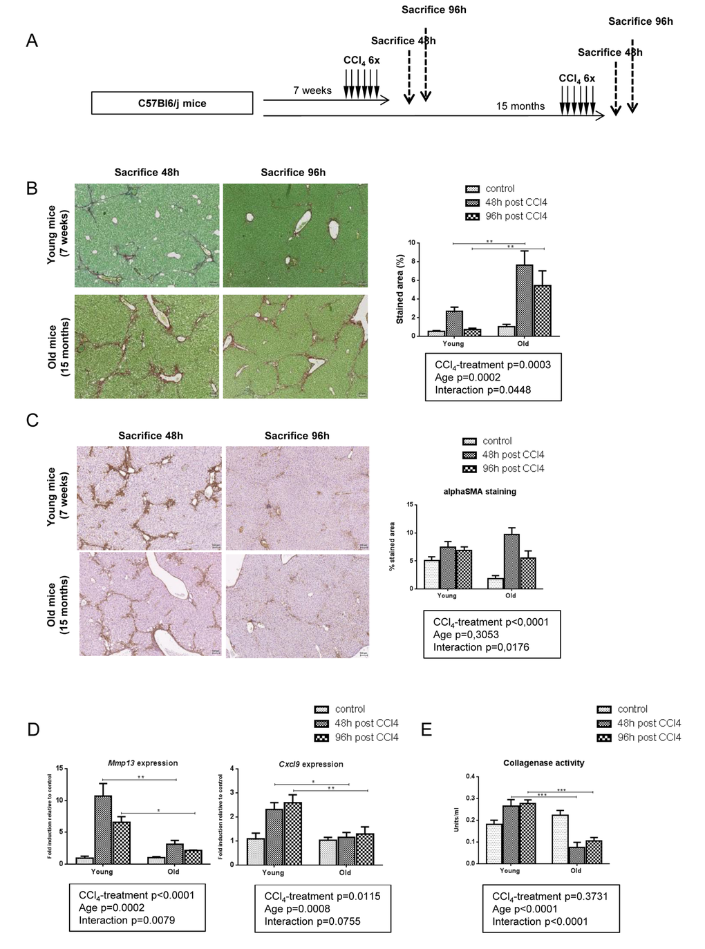A fibrotic regimen (CCl4 intra-peritoneal injection 750µl/kg body weight of CCl4 diluted in corn oil, 3 times a week for 2 weeks) was applied to young and old mice and started one week after their arrival in the facility. Control animals received injections of the same volume of corn oil (n=6 in the young group and n=6 in the old group). Mice were sacrificed 48 hours (n=6 in the young group and n=6 in the old group) or 96 hours (n=6 in the young group and n=6 in the old group) after the last injection. At the time of sacrifice, mice where anesthetized and the blood was drawn by cardiac puncture. The liver was rapidly dissected out. A part of the liver was immediately immersed in 4% formalin for histological analyses and the rest snap-frozen in liquid nitrogen and kept at -80°C until analyses.