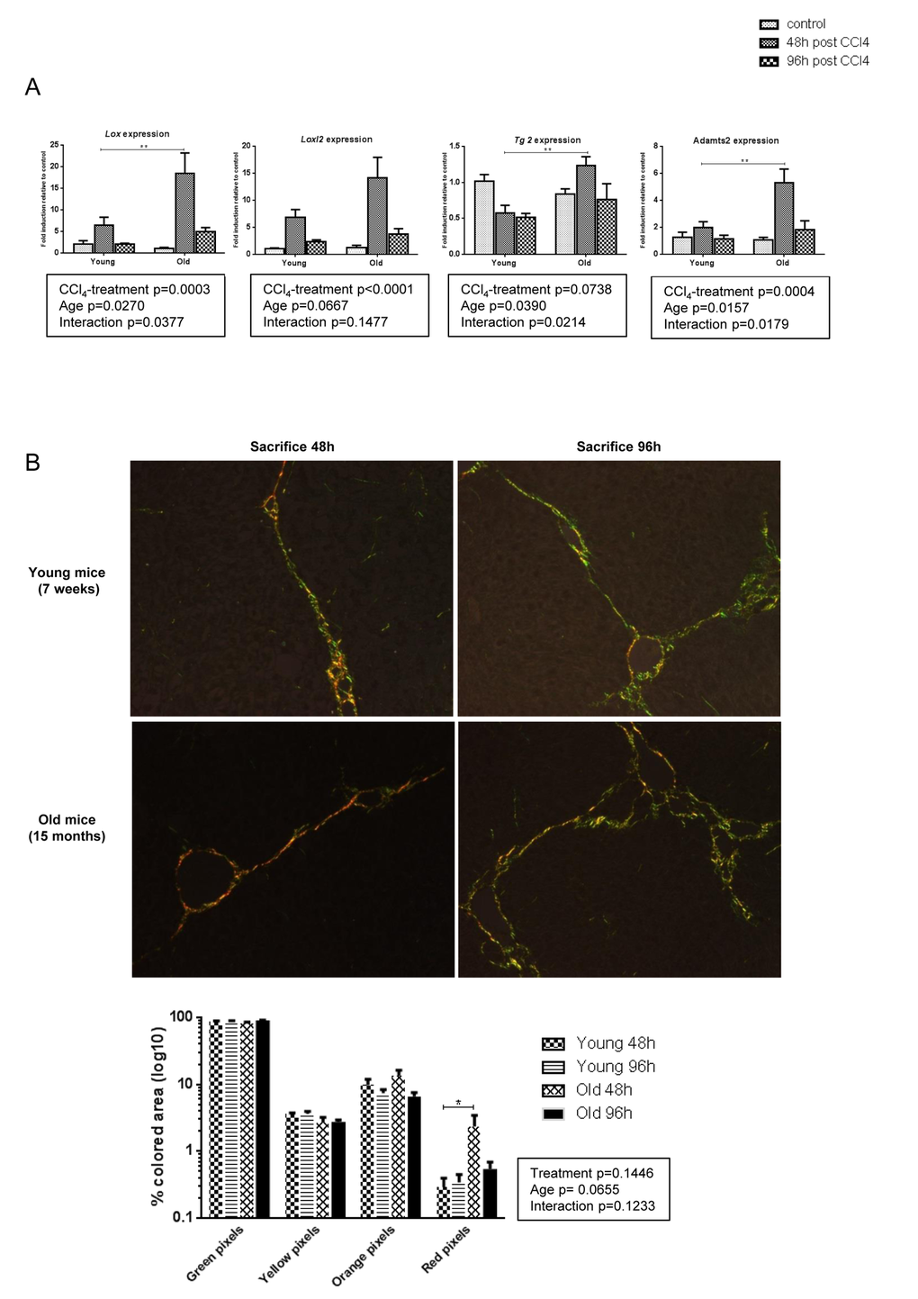 Post-translational processing of pro-collagen molecules and covalent cross-linking of collagen fibrils participates in the development of a mature and stabilized ECM and is an important limitation factor of fibrosis reversibility. Lysyl oxidase (LOX), LOX like 2 (LOXL2), a disintegrin and metalloproteinase with thrombospondin type I motif (ADAMTS2) and, while more controversial, tissue transglutaminase 2 (TG2) mediate ECM stabilization [26–29]. We evaluated the mRNA expression of these enzymes in our groups. In young mice, CCl4 caused a modest upregulation of Lox and Loxl2 while levels of Tg2 and Adamts2 were unchanged (Figure 5A). By contrast, expression of Lox, Tg2, and Adamts2 was significantly induced in old animals at time of peak fibrosis suggesting that in the aged liver cross-linking of the matrix proteins was more prominent. Moreover, the proportion of thick and dense red collagen fibers as visualized under polarized light was significantly higher in old mice at peak of fibrosis (Figure 5B). More pronounced cross-linking process in old mice would promote excess accumulation of thicker fibrotic septa and confer resistance to ECM proteolytic degradation even after the cessation of liver injury.