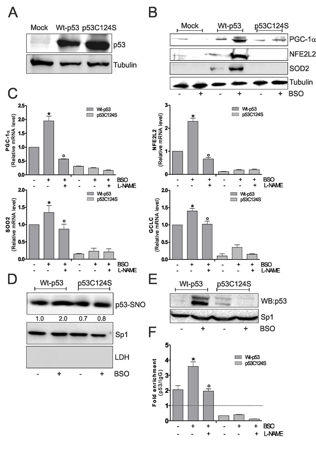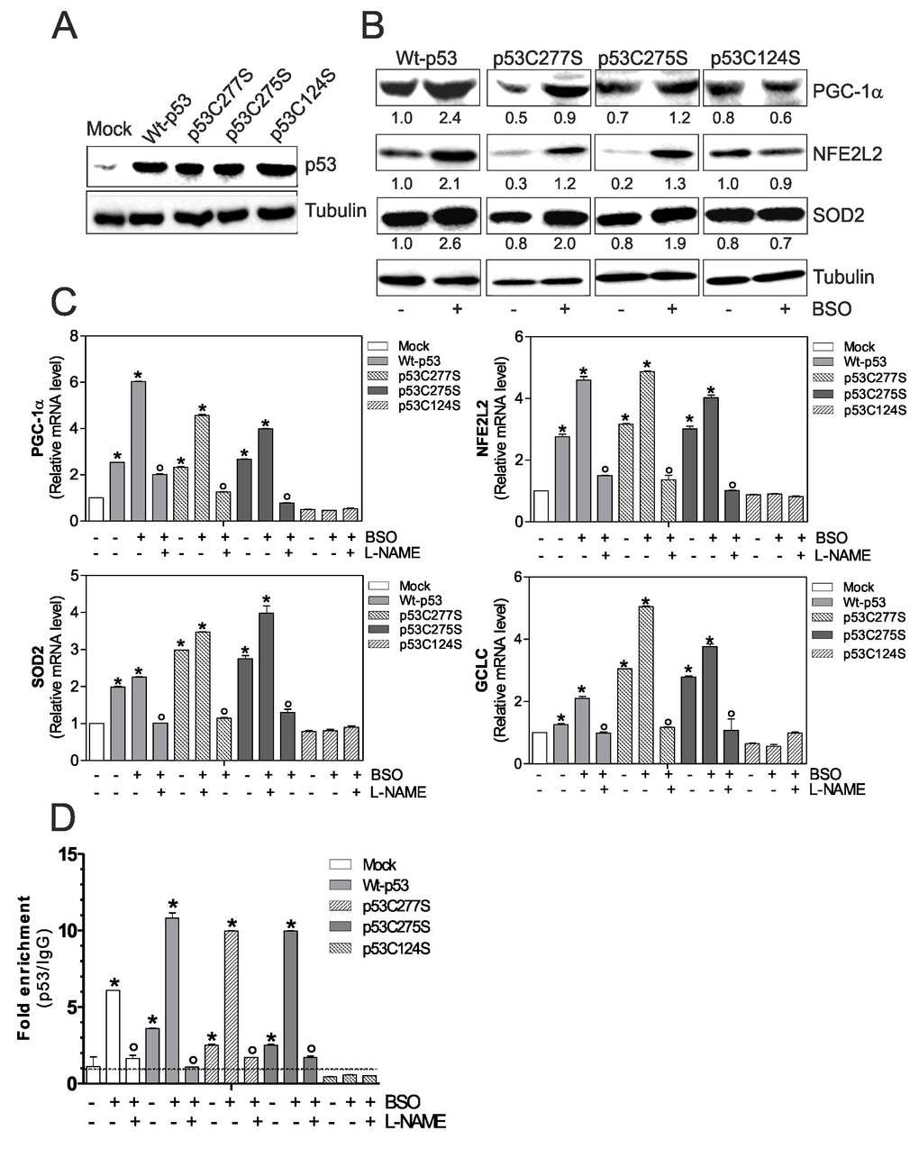To confirm the previously assessed involvement of NO in the induction of p53 we treated C2C12 myoblasts with a NOSs inhibitor, L-NAME, at the concentration of 100 μM. Fig.1C shows that L-NAME is able to prevent the increase of PGC-1α mRNA and its downstream target genes only in BSO-treated Mock, Wt-p53, p53C277S and p53C275S myoblasts.