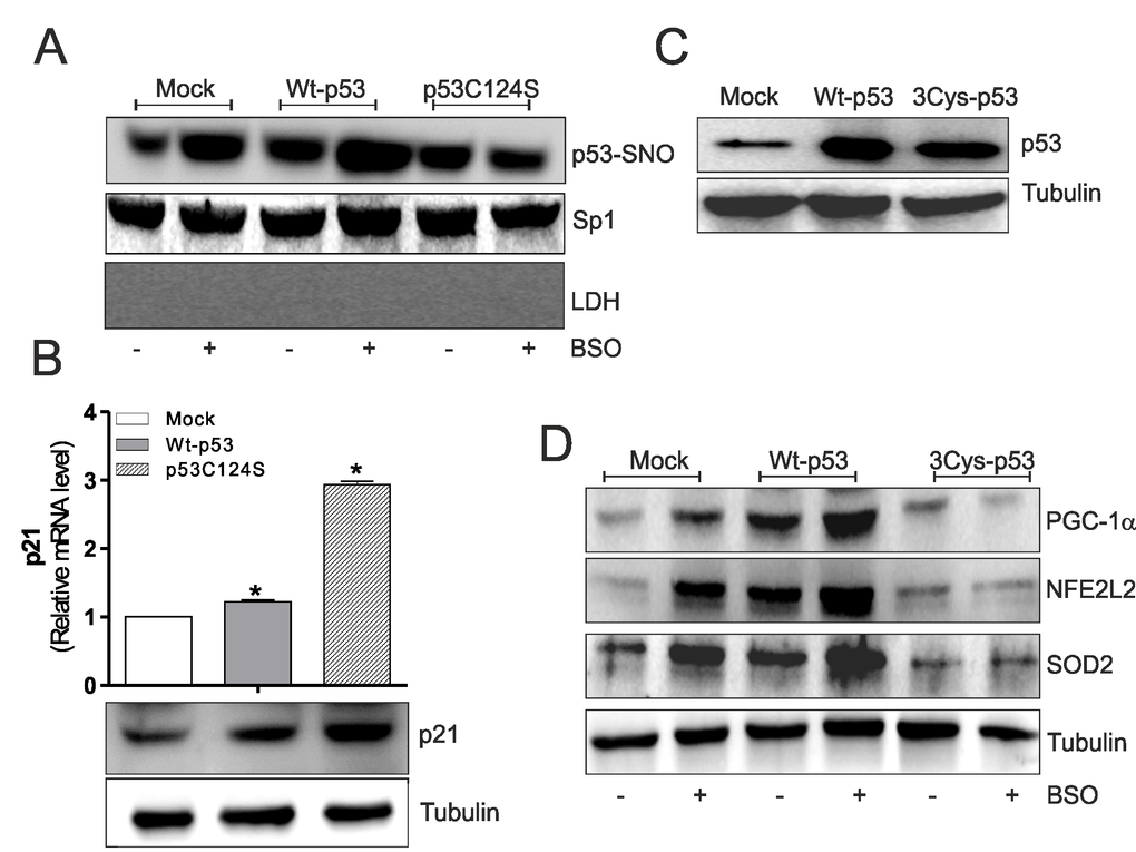 Here, we deeply dissected the p53-mediated signaling process under mild oxidative stress and we were able to identify a cysteine residue in the p53 DBD essential for the antioxidant response activation. Indeed, the data obtained with p53 mutants clearly indicated that the cysteine 124 was the sole and pivotal for induction of p53-mediated antioxidant response. Actually, the p53 C124S mutant failed to bind the p53RE on ppargc1a promoter abolishing the activation of antioxidant response.