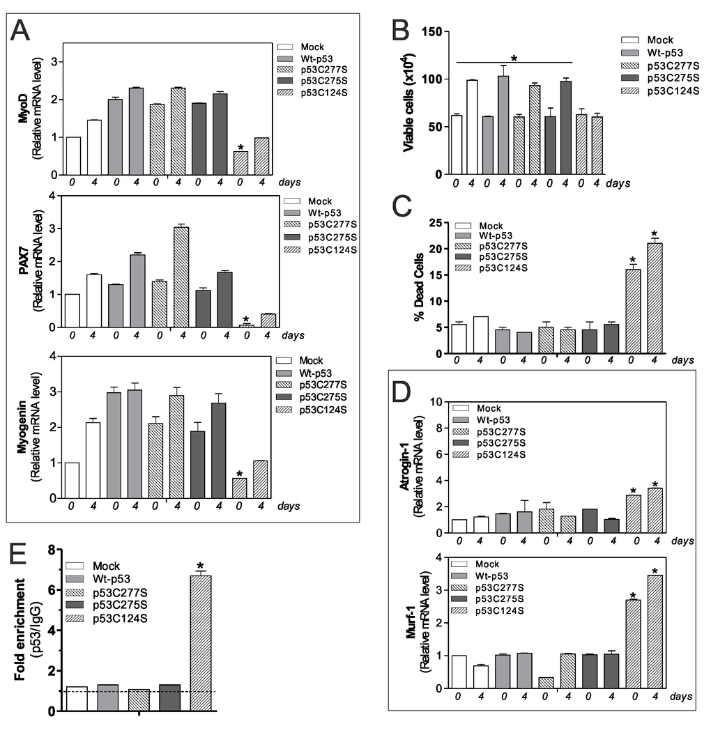 The effect of p53C124S overexpression on cell growth and viability was analyzed by direct counting by Trypan Blue staining. We found that the C124S mutation profoundly affected cell proliferation (Fig.4B) with an increase in dead cells (Fig.4C), indicating that both proliferation arrest and death occur. This is in line with the p21 protein increase observed in Fig.2B. Next, we have analyzed the mRNA levels of two atrophy markers Atrogin-1 (F-box protein 32) and MuRF-1 (tripartite motif-containing 63), which are two muscle-specific E3 ubiquitin ligases that are increased transcriptionally in skeletal muscle under atrophy-inducing conditions. Fig.4D highlights a significant raise of their expression only in undifferentiated and differentiated p53C124S cells, suggesting that this mutation not only inhibits antioxidant pathway but also blocks myoblasts cell differentiation inducing a degenerative process. To support the hypothesis that p53C124S mutant promotes the transcription of atrophy genes, we analyzed mouse MuRF-1 and Atrogin-1 promoters using Genomatix Software Suite database to identify p53RE. We have found five and one p53RE in mouse Atrogin-1 and MuRF-1 promoters, located at -519, -319, -82, -40, +31 and -351 respectively (Suppl.Fig.S2D, Suppl. Table S1). ChIP analyses of all p53RE were carried out to confirm the regulatory role of p53C124 mutant on the murine Atrogin-1 and MuRF-1 promoters. The qPCR analysis shows a significant increase only in p53C124S occupancy of -351 region on MuRF-1 promoter (Fig.4E), while -519, -319, -82, -40 and +31 regions on Atrogin-1 promoter did not show p53C124S binding at day 0 and 4 of differentiation (data not shown).