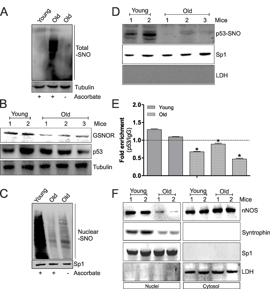 We have recently demonstrated that during aging of skeletal muscle a significant increase of oxidative/nitrosative stress occurs. In particular, we observed a decrease of GSH levels and a diminished induction of NO/PGC-1α-mediated redox signaling pathway accompanied by an accumulation of total S-nitrosylated proteins [12]. Since S-nitrosylation of C124 on p53-DBD seems to play a key role in the induction of NO/PGC-1α-mediated antioxidant pathway, we investigated the involvement of such mechanism in PGC-1α-mediated antioxidant response decrement during aging. Firstly, we confirmed the increase of total S-nitrosylated protein in skeletal muscle of old mice (Fig.5A). This result was also confirmed by the analysis of NADH-dependent S-nitrosoglutathione (GSNO) reductase (GSNOR), a denitrosylating enzyme that indirectly buffers the concentration of protein SNOs, by reducing the low-molecular-weight nitrosothiol GSNO. Fig.5B clearly indicates diminished protein levels of GSNOR in aged skeletal muscle, which could be in part responsible for S-nitrosylation protein increase. Moreover, total protein levels of p53 were slightly decreased in old with respect to young mice (Fig.5B). Subsequently, we analyzed the levels of nuclear S-nitrosylated proteins in aged skeletal muscle. As shown in Fig.5C, a decrease of nuclear S-nitrosylation is observed in skeletal muscle of aged mice. These results were confirmed by a decrease of p53-SNO levels in nuclei and a diminished binding of p53 on ppargc1a promoter (Fig.5D and E). These events probably elicited decreased PGC-1α-mediated antioxidant response observed during aging. Next to this, we have previously demonstrated that nNOS, interacting with Syntrophin, locates on nuclear membrane favoring local NO production, nuclear S-nitrosylation and induction of mitochondrial biogenesis during myogenesis [17]. These results strongly suggest the importance of nuclear nNOS activity in transcriptional regulation of NO/PGC-1α-mediated antioxidant target genes also during aging. For this reason, we analyzed nNOS and Syntrophin nuclear and cytoplasmic localization in young and old skeletal muscle. Western blot analysis of nNOS and Syntrophin carried out on nuclear fraction showed that these proteins were able to localize in nuclei only in young mice (Fig.5F), which exhibited a higher extent of S-nitrosylated proteins in nuclei with respect to aged mice (Fig.5C). Contrarily, nuclear associated nNOS was significantly diminished in aged mice, whereas its content is likely increased in cytoplasmic extracts (Fig.5F). Taken together, these results indicate that p53 binding on ppargc1a promoter requires the nuclear NO flux, which permits the transcription of ppargc1a gene and consequently the induction of antioxidant response, through the nitrosylation of p53-DBDC124. The decrement of nuclear nNOS localization during aging determines a loss of nuclear S-nitrosylated p53 and a failure in inducing PGC-1α-mediated pathway.