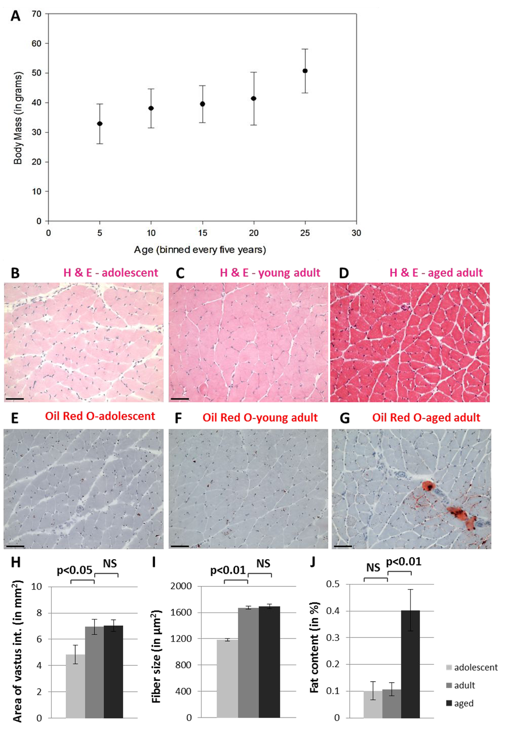 We conducted a comprehensive histological analysis of skeletal muscle tissue, specifically the vastus intermedius muscle of quadriceps, from adolescent (8 - 12 month old), young adult (4.5 - 6 year old), and aged adult (17.5 – 22 year old) NMRs (Figure 1). NMR skeletal muscle tissue stained with hematoxylin and eosin (Figure 1B-D) does not display pathological abnormalities such as angular fiber shape, non-peripheral nuclei, excess fibrous tissue or the presence of inflammatory cells, although aged muscle contains increased fat deposits (Figure 1D,G). Additional histological analysis demonstrates that the total cross-sectional area of this muscle and the size of individual muscle fibers (Figure 1H-I) increase during maturation (p<0.05 and p<0.001, respectively), but do not change size upon further aging (p>0.05, two-tailed t-test). The fat content within this muscle is significantly increased in aged adults compared with adolescents and young adults (Figure 1J, p<0.01). While muscle wasting causes loss of bulk in many mammals during aging, we find that NMRs do not lose body mass in the first twenty years of life (unpublished observations). These data, which support the maintenance of skeletal muscle integrity into old age, are broadly in agreement with reports from other laboratories who have observed age-related muscle atrophy in NMRs only above 28 years of age [25].