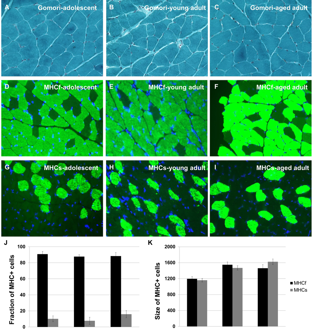 Sections of quadriceps muscle were subjected to immunohistochemical staining to assess skeletal muscle fiber subtypes. Slides were post-fixed in 4% cold paraformaldehyde, then rinsed with PBS. Sections were incubated for one hour at room temperature in blocking solution (5% donkey serum and 0.1% Triton-X in PBS), then incubated overnight at 4°C with primary mouse monoclonal antibody diluted in blocking solution (antibody details in Supp. Table 2). Sections were rinsed with PBST (0.1% Triton-X in PBS), incubated in donkey anti-mouse secondary antibody, rinsed with PBST, and co-labeled with Hoechst nuclear dye (1μg/mL). Coverslips were mounted with Citifluor. Sections were observed using a Zeiss AxioImager. The fraction of slow-twitch and fast-twitch skeletal muscle fibers was compared between age groups using a two-tailed t-test in Excel.
