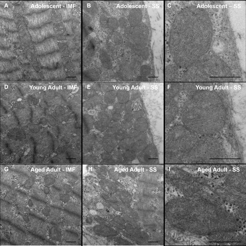 To assess the ultrastructural integrity of skeletal muscle fibers in the aging naked mole-rat, we evaluated this tissue using transmission electron microscopy (Figure 3). No obvious differences were observed between the samples. In particular, no signs of age-related pathology such as autophagy or abnormal mitochondrial morphology were observed in any sample.