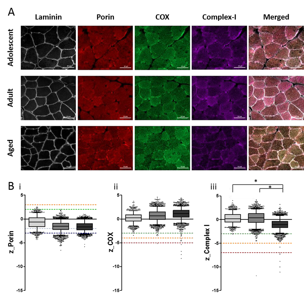 10µm thick sections of transversely orientated skeletal muscle (quadriceps) were cut for 15 animals (one animal was excluded due to insufficient tissue). Two sections from each animal were required for this protocol; one designated OXPHOS and one as a no primary control (NPC). Sections were left to air dry for one hour prior to fixing in cold 4% paraformaldehyde, washing in 0.25% TBS-T (0.25% Tween-20 in TBS) and permeabilisation along a methanol gradient. Following blocking in 10% normal goat serum (Sigma), OXPHOS sections were coated with a cocktail of primary antibodies, while NPC sections were stained only with laminin antibody. Slides were incubated at 4°C overnight in a humidified chamber then washed with 0.25% TBS-T. Both OXPHOS and NPC slides were incubated with secondary antibody cocktail at 4°C for 2 hours. After further washing with 0.25% TBS-T, all slides were incubated with a streptavidin-conjugated antibody for 2 hours at 4°C. Slides were then washed for the final time with 0.25% TBS-T and mounted in Prolong Gold (Sigma).