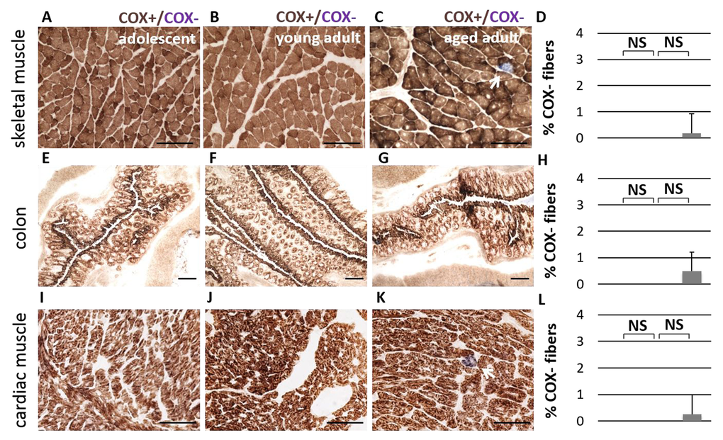 To further investigate mitochondrial function during normal aging in the naked mole-rat, we first measured OXPHOS enzyme activity with combined histochemistry. Complex IV (cytochrome c oxidase, or COX) is an enzyme with both nuclear- and mitochondrial-encoded subunits, which becomes dysfunctional when mtDNA is mutated, while succinate dehydrogenase (SDH) is a nuclear-encoded OXPHOS enzyme whose function is independent of mtDNA. Skeletal muscle fibers with functional COX activity are made visible by sequential oxidation-reduction steps in the presence of a catalyst. Cells with functional cytochrome c oxidase stain brown, while cells with insufficient COX enzyme activity stain only with SDH and appear blue. All fibers in the skeletal muscle tissue of adolescent and young adult NMRs stain COX+ (Figure 5A-B). By comparison, a very small number of COX-deficient cells were observed in aged adult animals (Figure 5C, p > 0.05, not significant). COX-deficient cells are very rare, comprising approximately 0.1% of total cells in older individuals (Figure 5D). By comparison, chronologically-matched (55-80 year old) humans and (3 year old) rats without skeletal muscle pathology exhibit COX-deficiency in approximately 2% of muscle fibers [26-28]. Other naked mole-rat tissues, specifically heart and colon, show little to no incidence of COX-deficient fibers with age (Figure 5).