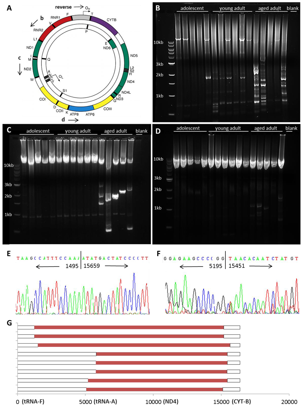 Adolescent NMRs have largely wild-type mtDNA, and the prevalence of shortened bands increases with age. Wild-type mtDNA was amplified in most samples, although shorter templates amplify more readily, so less wild-type mtDNA may be observed in samples with a variety of deletions [31]. The locations of the breakpoints were narrowed down by nesting primers further into the genome (Figure 6C-D). We sequenced bands to verify the authenticity of shortened mtDNA fragments and to identify the precise location of breakpoints in the mitochondrial genome of young and aged adult NMRs, where the sequence jumps to one location to another. (Figure 6E-G). These results demonstrate the accumulation of what appear to be large deletions affecting the entire major arc of the NMR mitochondrial genome. Similar large deletions have been noted in human tissues and shown instead to be partial duplications of the minor arc [30]. It is notable that all rearrangements in naked mole-rat muscle tissues appear to be at least 9600bp in size; bands signifying smaller (true) deletions, such as the common deletion observed in human tissues, are not detected.