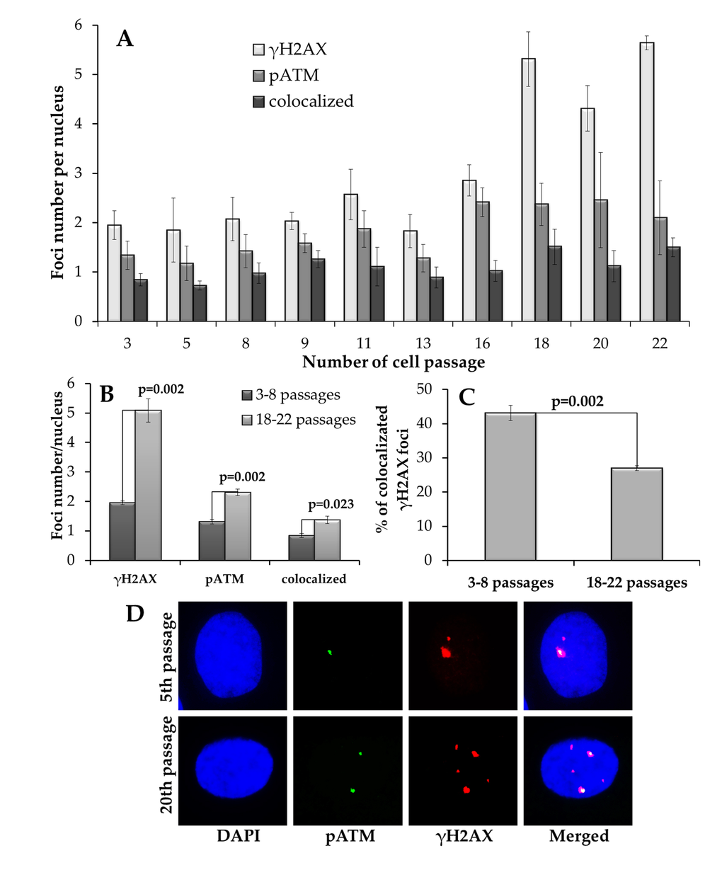 Quantification of γH2AX foci in MSCs at different passages is shown in Fig. 1A. It can be seen that between passages 3-16, the number of γH2AX foci did not change (r=0.66; p=0.11), whereas at passages 16-22, the number of the foci doubled. In contrast, phosphorylated ATM (pATM) foci increased gradually with the increase in the passage number (Fig. 1A). The pATM data could be best fit with a linear regression equation y=0.99 + 0.07x (r=0.83; p=0.003), where y is the number of foci per nucleus, X is the passage number. Similar pattern was observed for γH2AX foci co-localized with pATM foci: y=0.72 + 0.03x (r=0.73; p=0.017).