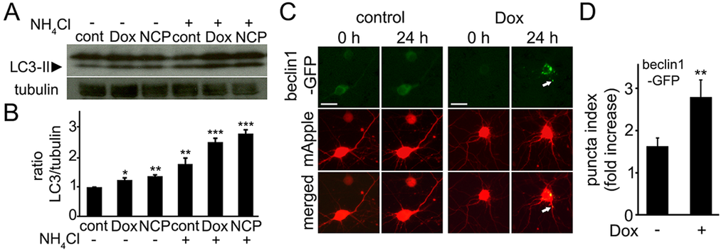 Commonly used methods for monitoring autophagy are based on biochemical properties of an autophagy protein LC3. When an autophagosome forms, a proteolized form of LC3, LC3-I, is lipidated and can be detected as a mobility shift by western blotting. Increased LC3-II levels can also be a consequence of autophagic blockade at some step after the conversion of LC3-I to LC3-II. To determine if doxorubicin stimulates neuronal autophagy, we treated primary cortical neurons with doxorubicin or with doxorubicin and NH4Cl, which neutralizes the lysosomal pH and inhibits the last step of autophagy-mediated degradation, or with NH4Cl alone. LC3-II levels were higher in neurons incubated with the combination of doxorubicin and NH4Cl than in neurons incubated only with doxorubicin, indicating that autophagy is indeed upregulated (Fig. 1A,B).