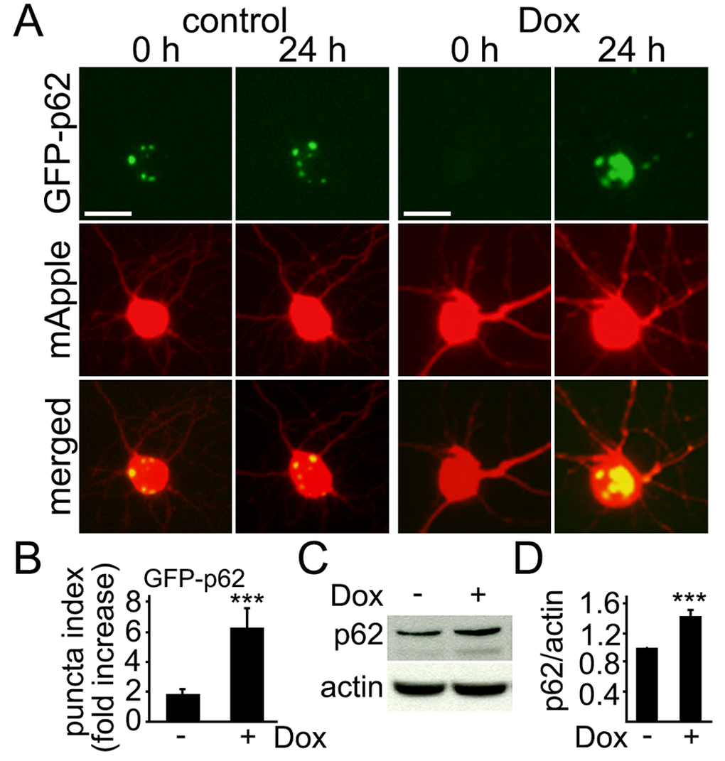 Next, we tested if the levels of endogenous p62 change in neurons treated with doxorubicin. Cultured cortical neurons were treated with either a vehicle or doxorubicin, lysed and analyzed for p62 (Fig. 2C,D). As expected, p62 levels were higher in neurons exposed to doxorubicin. Our data suggest that doxorubicin-treated neurons exhibit upregulated autophagy and there is some flux though autophagy, but autophagy is impaired and inefficient.