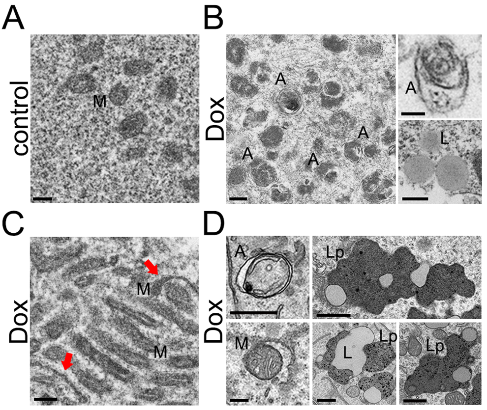 We were impressed by the changes we observed in doxorubicin-treated cultured neurons, and wondered if we could detect these pathologies in vivo. Mice underwent a course of chemotherapy with doxil, the liposomal doxorubicin frequently used in human patients. Mice were then perfused, and their brains were analyzed by electron microscopy. Remarkably, we observed autophagosomes, which often contained mitochondria. Some autophagosomes were empty, as in neurodegenerative Huntington’s disease [41] (Fig. 3D). We also detected the accumulation of lipid droplets and lipofuscin, a mixture of oxidized proteins and lipids, found in aged brains and in Batten disease (Fig. 3D) [42,43]. These data directly confirm that the treatment with doxorubicin leads to the accumulation of damaged organelles, autophagosomes, and lipid droplets.