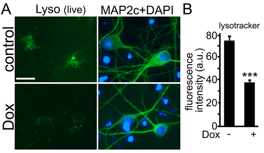 Neurons treated with vehicle or Dox were incubated with 400 nM Lysotracker Green for 10 min, imaged, and the green fluorescence intensity was quantified. Then cells were fixed and immunostained against MAP2c and stained with DAPI dye, as described above, to visualize morphology and nuclei of neurons.