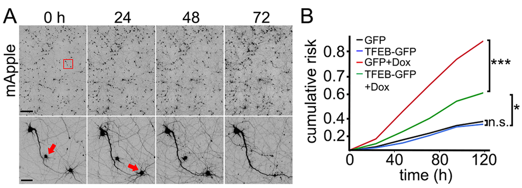We examined the survival of neurons that were treated with doxorubicin when TFEB was overexpressed. Four neuronal cohorts were transfected with mApple (a morphology and viability marker). The first and second neuronal cohorts were co-transfected with GFP; the third and fourth cohorts were co-transfected with TFEB-GFP. The first and the third cohorts were treated with a vehicle, and the second and the fourth were treated with doxorubicin. Neurons were followed longitudinally by automated microscopy, and the cumulative risk of neuronal death was calculated with longitudinal analysis (Fig. 5A,B). This technique allows us to track large cohorts of individual neurons over their lifetimes and to measure their survival with the statistical approaches used in clinical medicine [25,37,45,49]. By tracking neurons over their lifetimes, we can determine whether applied drugs or expressed proteins contribute positively, negatively or neutrally to neuronal fate. We found that the expression of TFEB promotes neuronal survival of doxorubicin-treated neurons, as expected (Fig. 5B).
